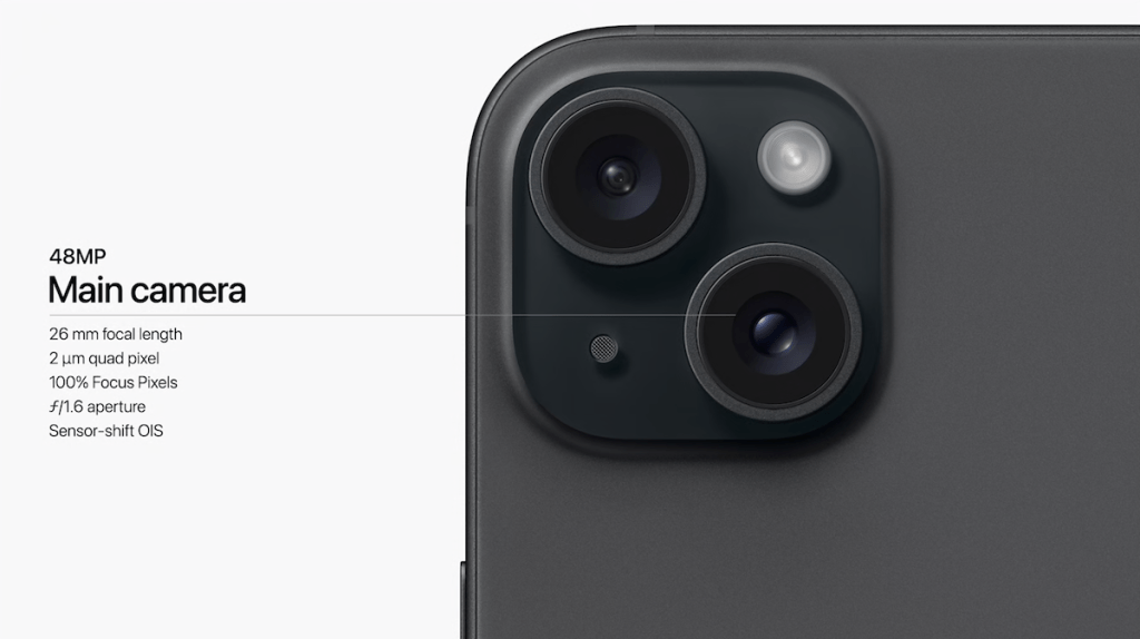 ▲iPhone 15及iPhone 15 Plus廣角主鏡雙雙由上代12MP升級至48MP。