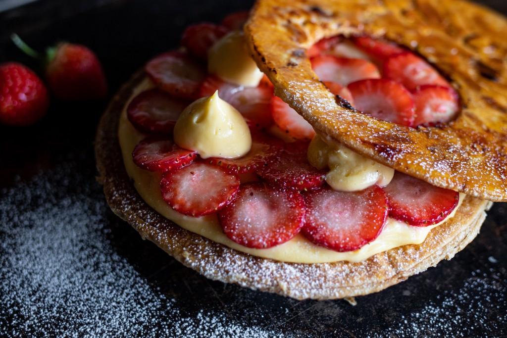 拿破侖Mille-pressé的酥皮制法一絲不茍,不但九成食材引入自日本、法國及意大利,更以秘方及自研專利機器壓制做出脆薄酥皮,加上專利機器烘烤餅皮,除防止牛油氧化,更可令酥皮長時間保留牛油香味??谖斗矫?,包括8款甜、4款咸拿破侖Mille-pressé,當中以草苺為賣點的“Nepoleon”(原味草苺)最為熱賣,采用直送當造草苺炮制。咸點則必試位列IG打卡頭3位的“Jambon & Fromage”(雙重芝士火腿)拿破侖,材料包括車打芝士、水牛芝士、火腿及黑椒薯蓉,芝士更呈“拉芝”的半融狀態。慶祝首間海外分店開幕,香港獨家推出“奶茶忌廉芒果”口味,香滑忌廉以香港特色奶茶制成,配酸甜多汁的芒果,再飾上黑糖核桃,完美結合茶香與水果的香甜味。拿破侖Mille-pressé分量充足,備有“Half-Half”點選,客人可依喜好揀選兩款甜點口味。