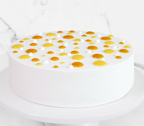 ▲芒果海綿蛋糕(件裝 $68、原個蛋糕9吋 $680),造型清雅簡約,白色淡忌廉佐橙黃果泥及海綿蛋糕,簡單又美味。