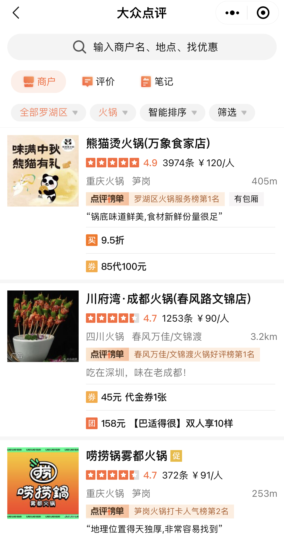 打開“大眾點評”---選擇左上角“美食”----輸入“火鍋”可以直接查看附近的火鍋店。