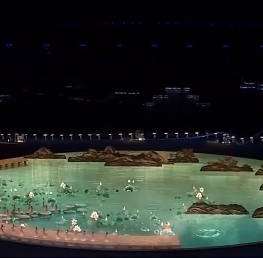 這次開幕式,現場將通過地上屏幕和立體透視網幕的配合,以裸眼3D的視效,直接將錢塘江和青山綠水搬到舞臺上。陸川導演透露,這個網幕是地球上最大的銀幕,有9個IMAX那么大。但總導演沙曉嵐預告,從電視機里看開幕式效果將不亞于現場。