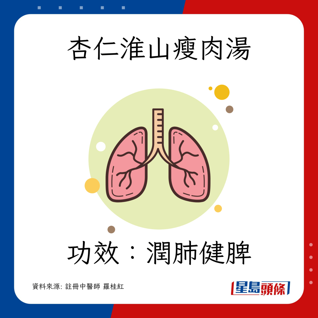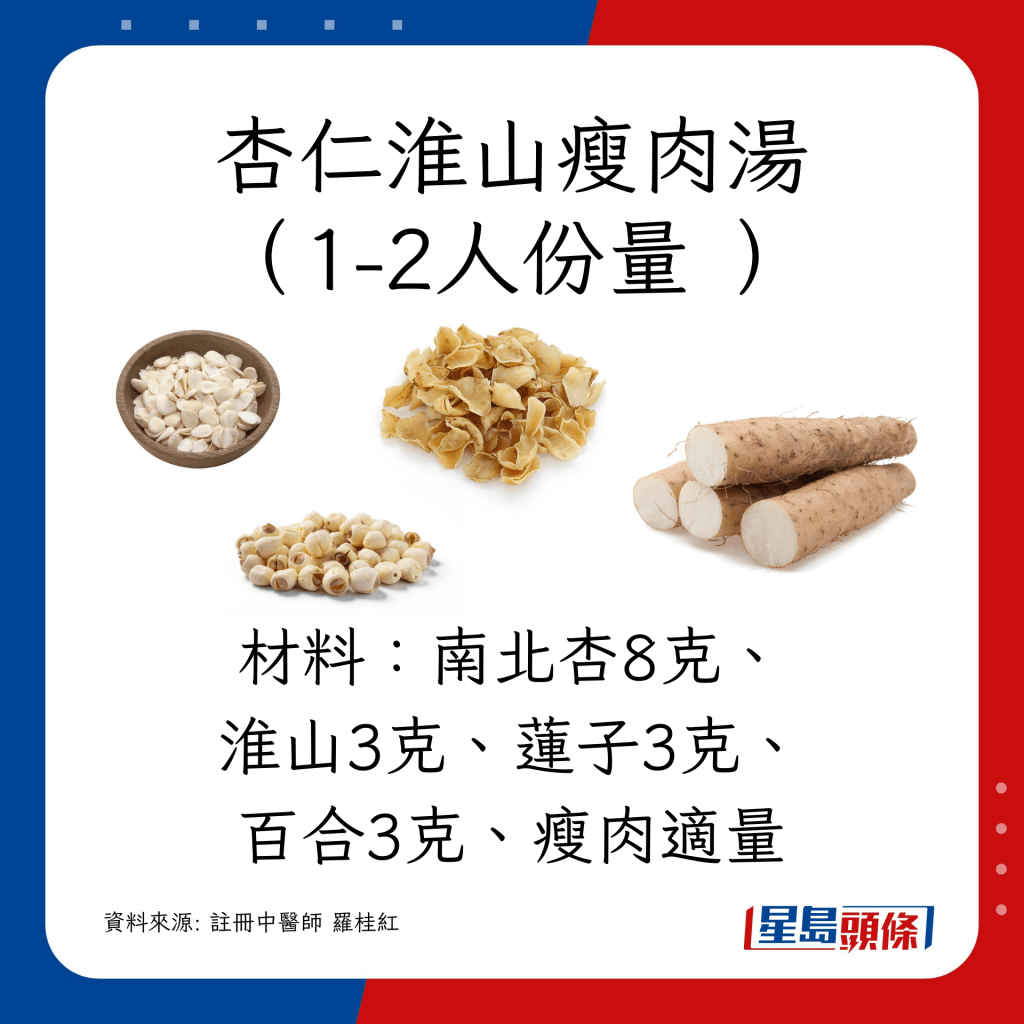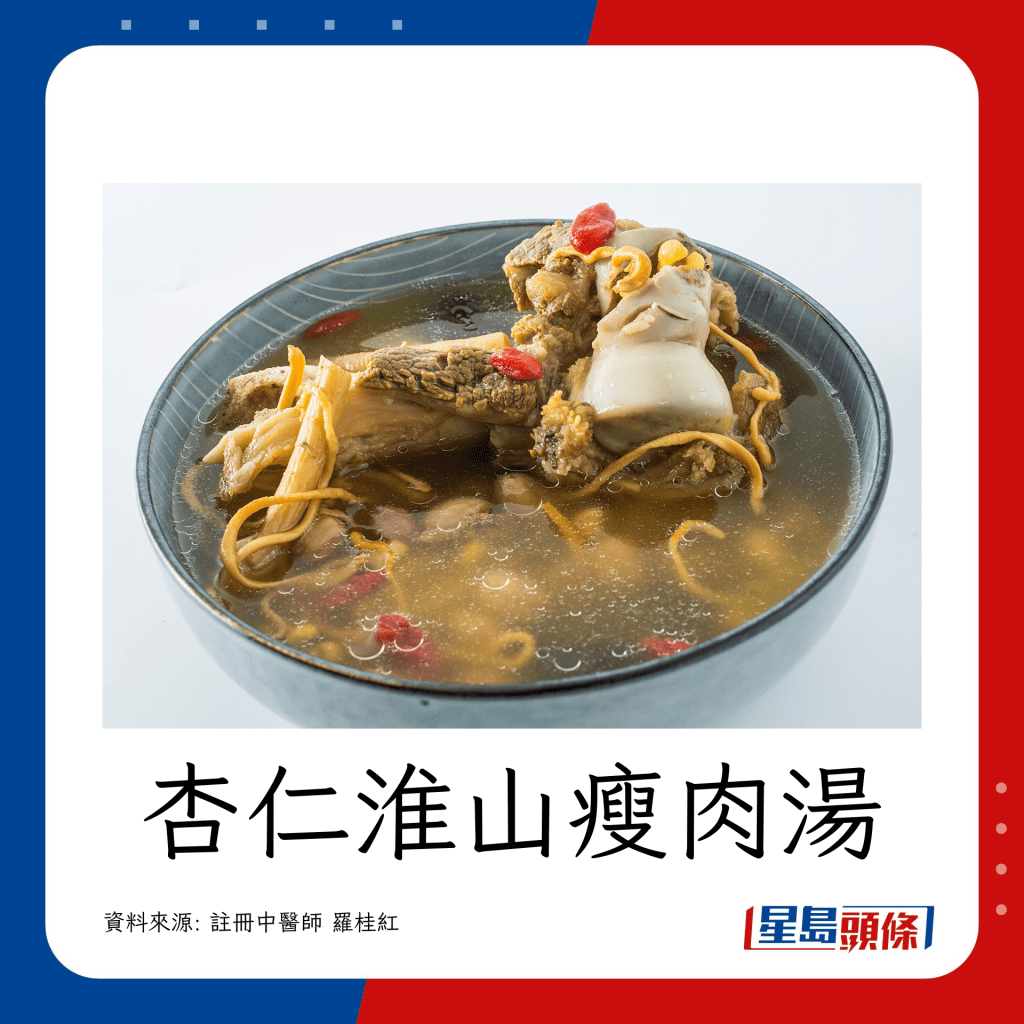 杏仁淮山瘦肉湯、海參銀耳瘦肉湯,功效、材料、做法如下: