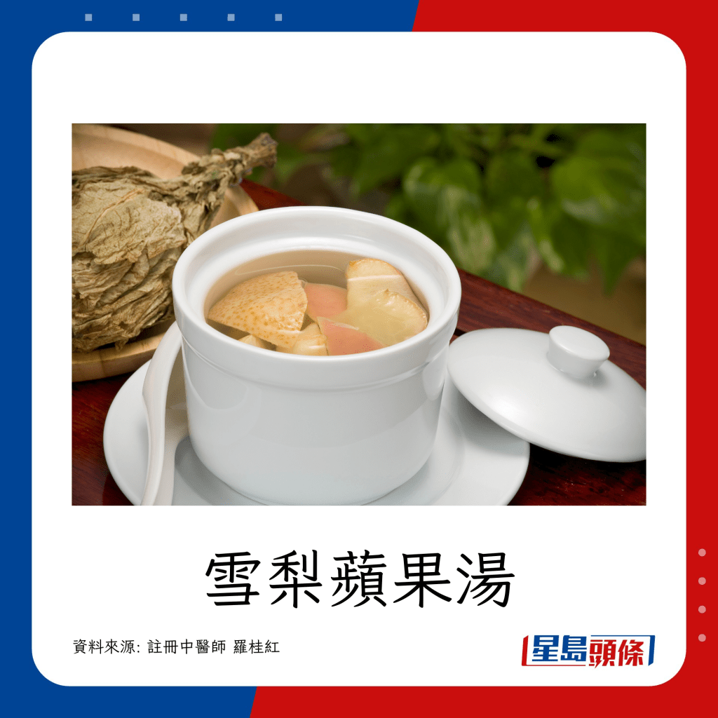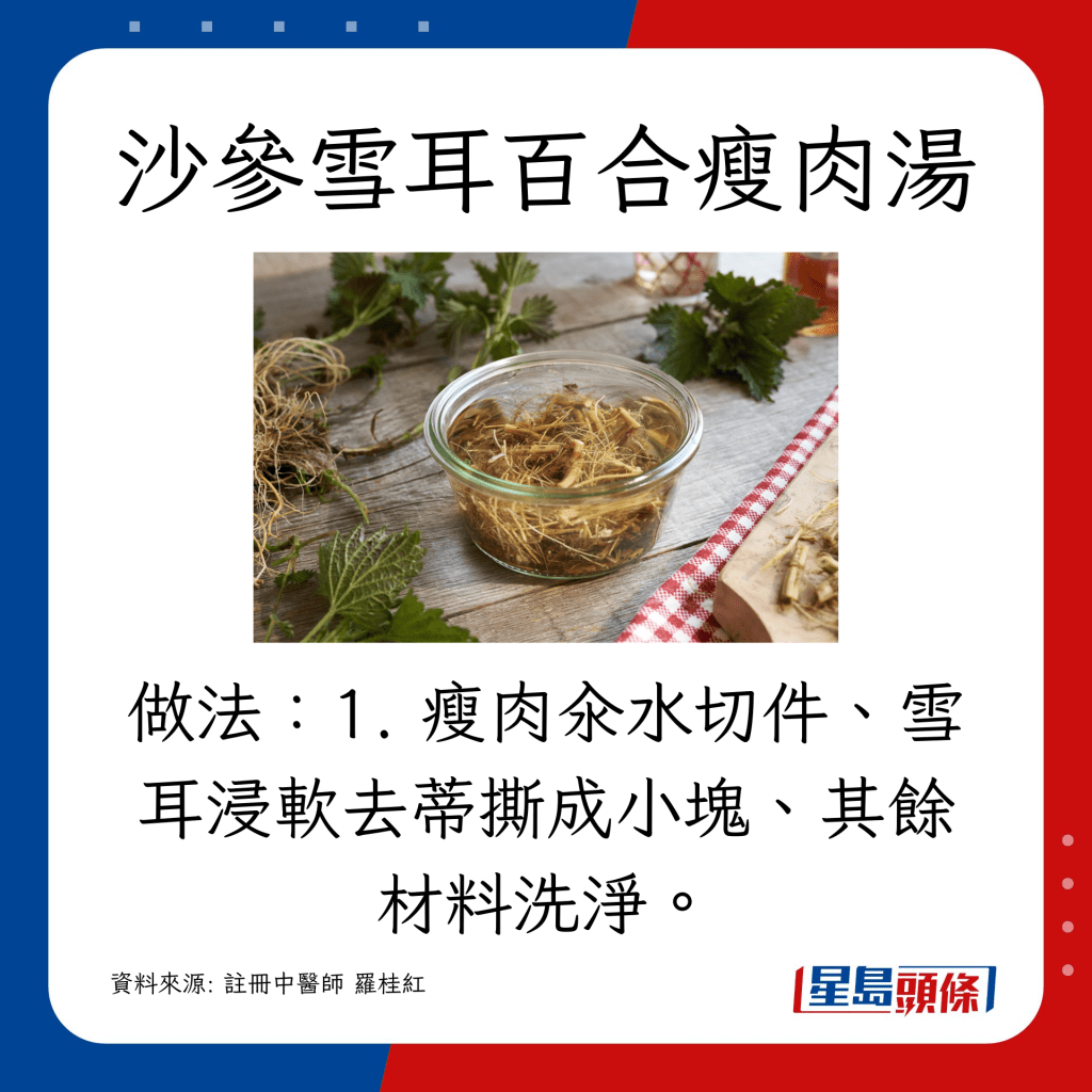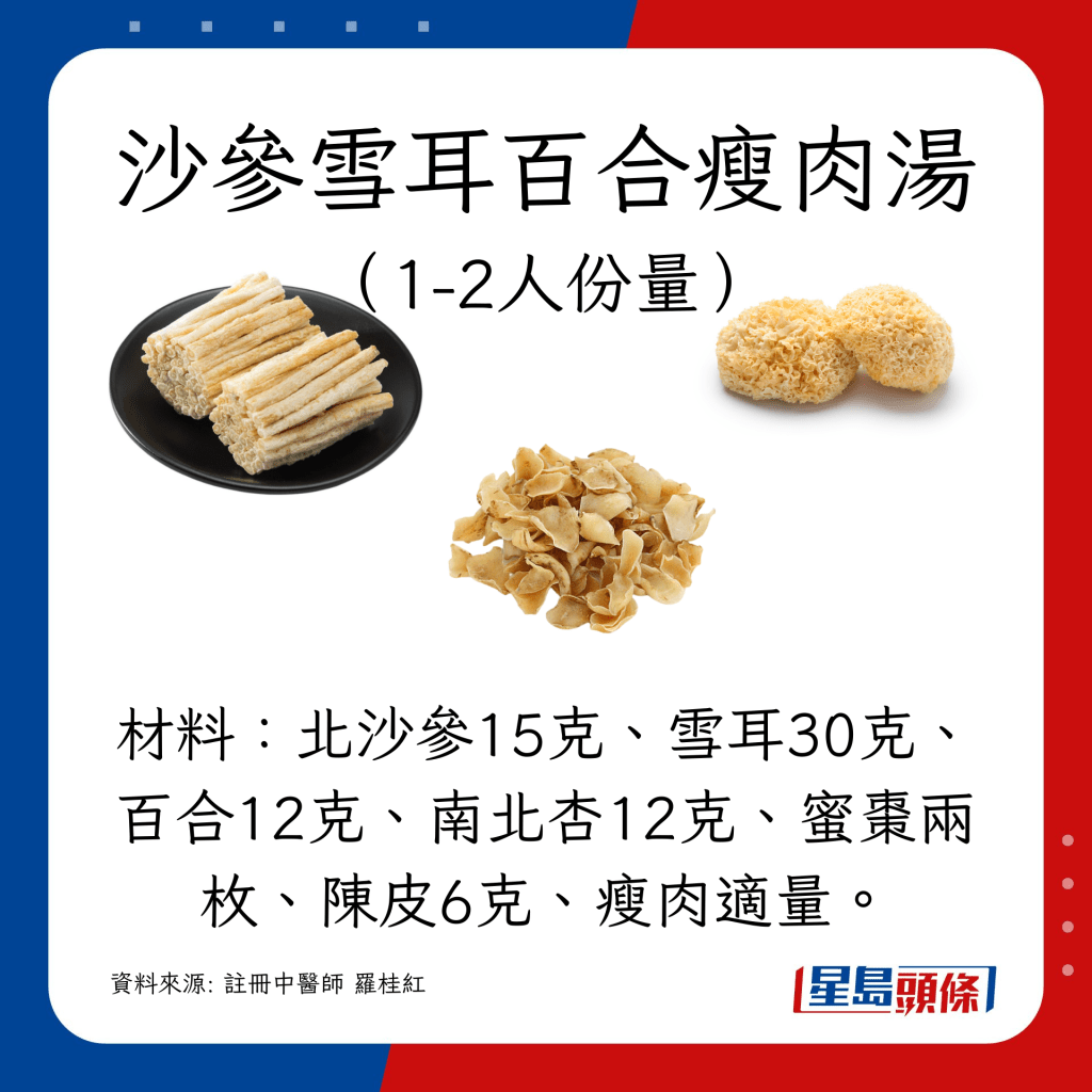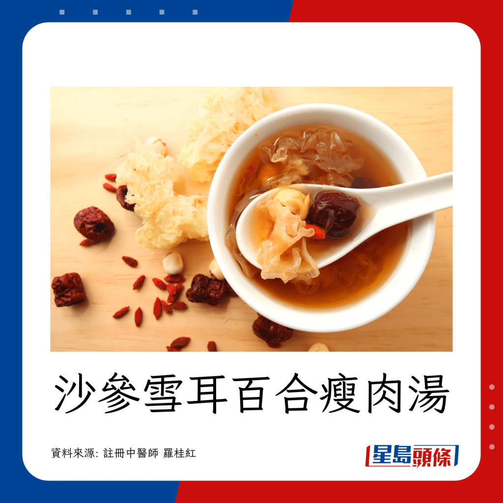沙參雪耳百合瘦肉湯、雪梨蘋果湯,功效、材料、做法如下: