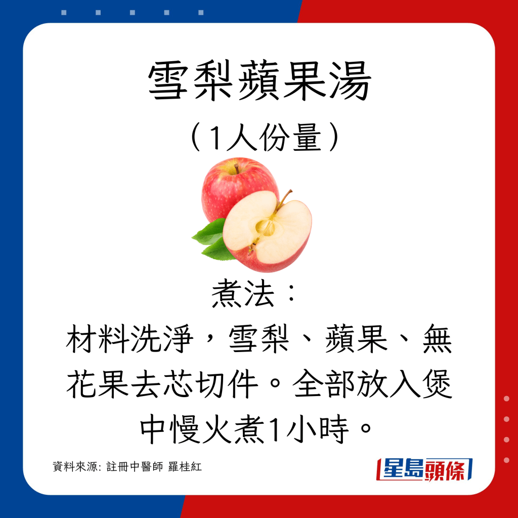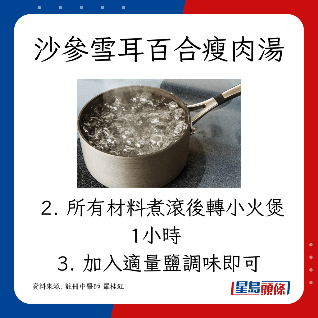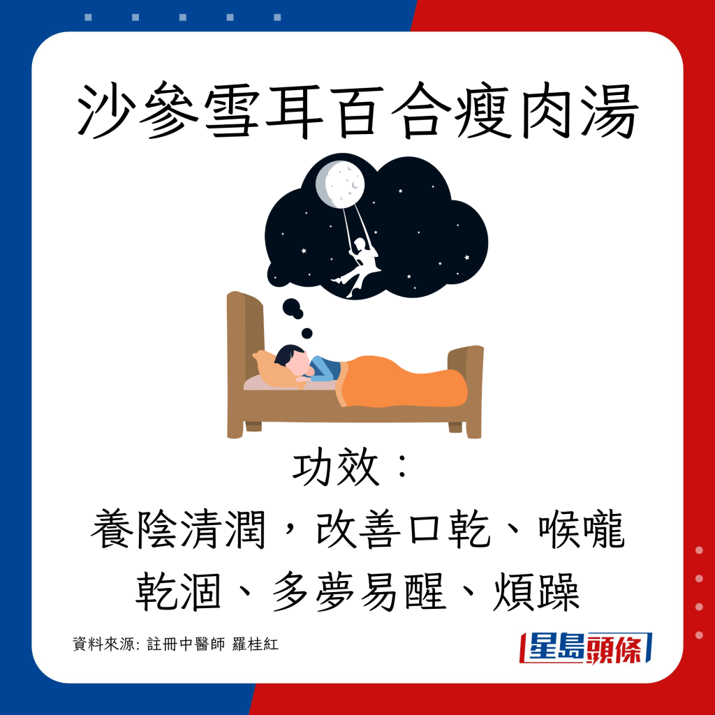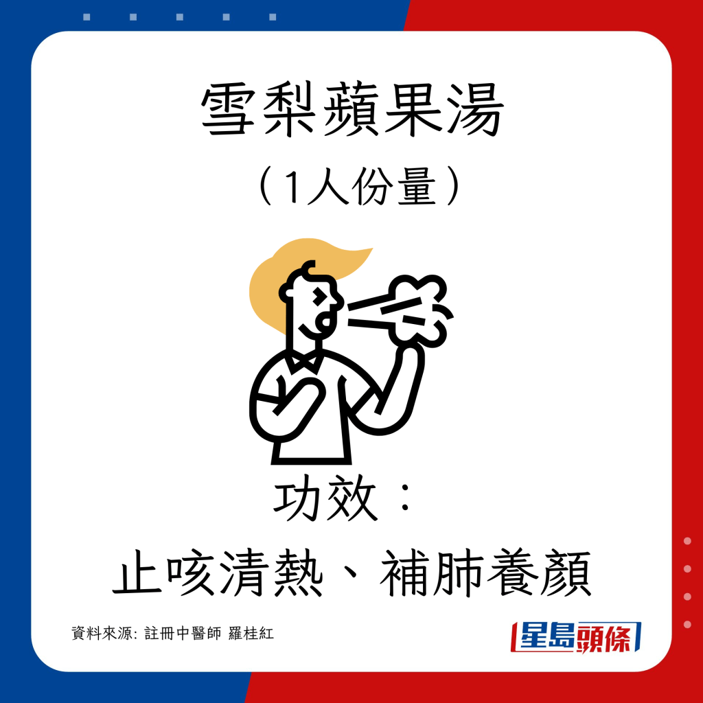 沙參雪耳百合瘦肉湯、雪梨蘋果湯,功效、材料、做法如下: