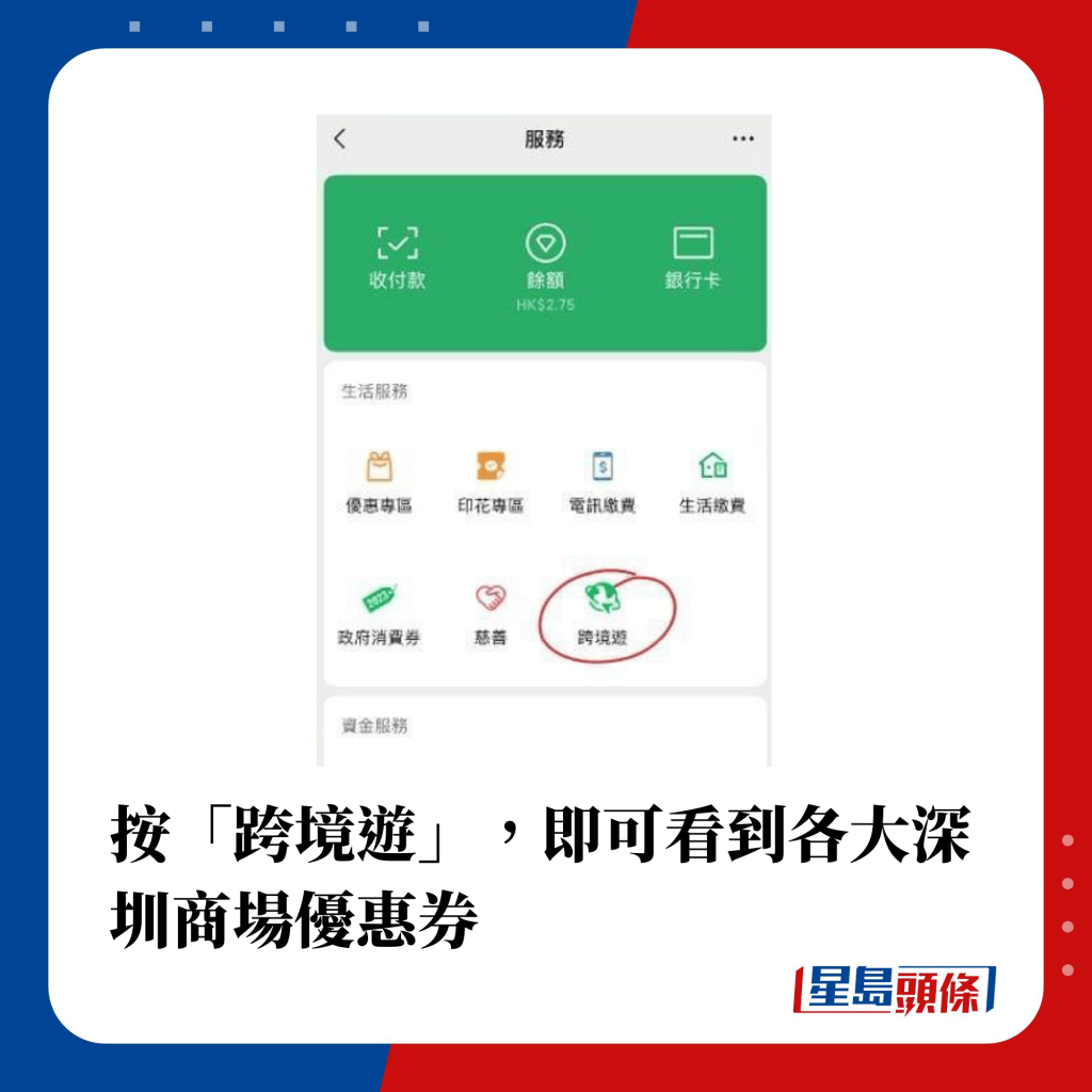 WeChat微信用戶只需點擊“我”,再選擇“服務”,按“跨境游”,進入“商場名字”頁面,即可領取6大商場優惠券,下單時向店員出示優惠券,跟隨指示完成換領或付款步驟即可。深圳商場優惠相當豐富,包括深受港人歡迎的金鴨季、潤園四季椰子雞等優惠或現金券!