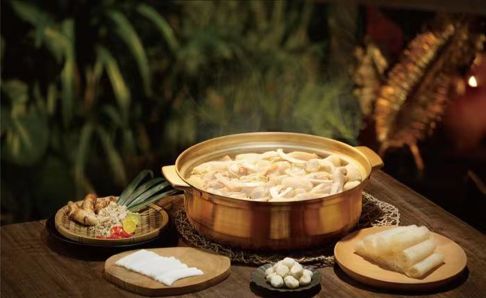 海南椰青+泰國香水椰青混合成一定的黃金比例,隨著溫度的攀升,椰子和雞肉的精華都融入湯底,熬出來的湯喝下去鮮香又濃郁。洗完“椰子浴”的雞肉,撈起后椰子的清香已經完全滲透入雞肉的紋理中了,鮮嫩可口。一口下去鮮甜的雞肉汁水在唇齒間滲出,椰子水的清甜滋味在舌尖能環繞許久。