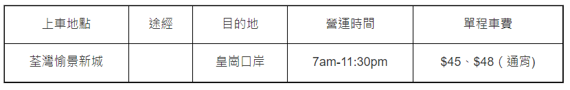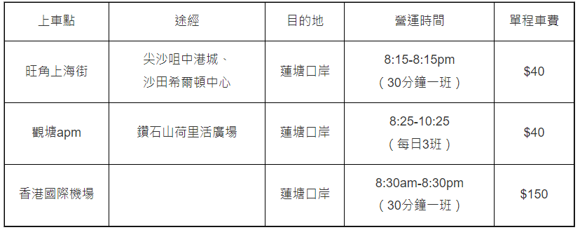 環島旅運是其中一間最大的客運巴士公司,在港有超過 30 個上車站點,能前往皇崗口岸、深圳灣口岸、蓮塘口岸、深圳南山區等,最頻密 30 分鐘一班次。車費方面,以將軍澳或旺角前往蓮塘口岸為例,單程只要$40;其他市區位置上落車,亦不過$50-$65不等,如購買來回乘車套票,價錢更加便宜。