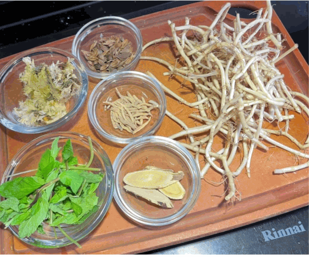 材料:新鮮桑葉、杭菊15克,洋金菊15克,甘草2片,連翹20克,水2000公升