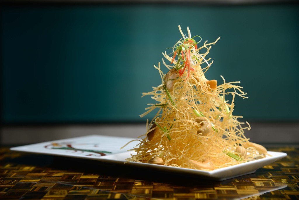 如注重刀工、步驟及火候的金絲脆腰果,先將芋頭手切成極幼細的芋絲,然后放進能把幼絲炸脆卻不焦黑的油溫中,時間掌控準繩,令每條幼絲酥脆不易斷折。 另加上適量的腰果及白醋混合蜜糖的醬汁,呈現甜酸香脆的獨特風味。