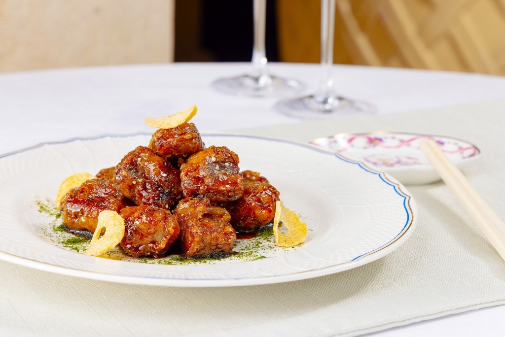 好像玉露金菜燜釀關東遼參,選用玉露、金菜、豬肉、蝦米及淮山等燜煮關東遼參,再加玫瑰露酒及甜面醬提升味道和口感。 茶香檸檬脆肉排的靈感來自傳統粵菜中的香煎牛仔骨,把肉鮮細嫩的豬肉排混合普洱、陳皮、蜜糖和檸檬,吃起來酸中帶甜。