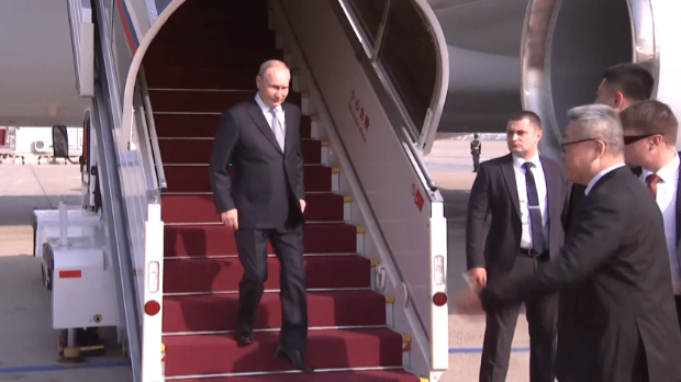 ▲來華出席第三屆“一帶一路”國際合作高峰論壇的俄羅斯總統普京10月17日上午抵達北京。 央視截圖