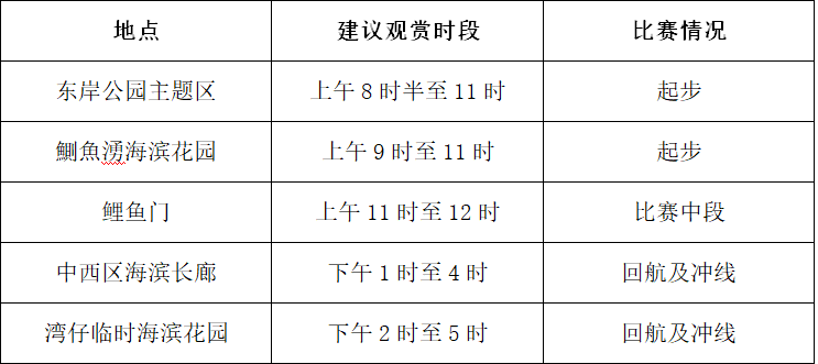 市民如未能早起,則可以選擇在下午1時至4時在中西區海濱長廊,在這里可見到參賽船隊。然后是最精彩一刻,下午2時至5時,各支船隊將陸續沖線,各位可到達灣仔臨時海濱花園,便可見證冠軍誕生,也可趁機拍攝參賽船只及運動員的風采,絕對不容錯過!