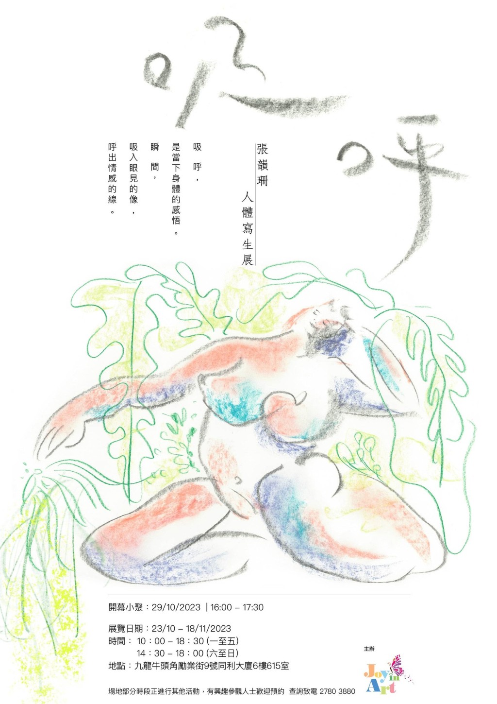 《吸 呼》人體寫生展覽由香港藝術家張韻珊創作。張韻珊是本地兒童繪本作家,在香港理工大學視像傳意學士畢業,現職插畫、平面設計及親子藝術工作坊導師,曾獲香港設計師協會環球設計大獎Excellence Award等藝術獎項。在《吸 呼》展覽中,張韻珊形容“吸 呼”是當下身體的感悟瞬間,吸入眼見的像,呼出情感的線。展覽將展出張韻珊過去兩年創作的人體寫生畫作,展覽期間更會舉辦人體寫生體驗班,讓觀眾嘗試由藝術家帶領下,透過觀察,眼、手、心連系進行創作,引動身體探索內在,嘗試一場動態的線。