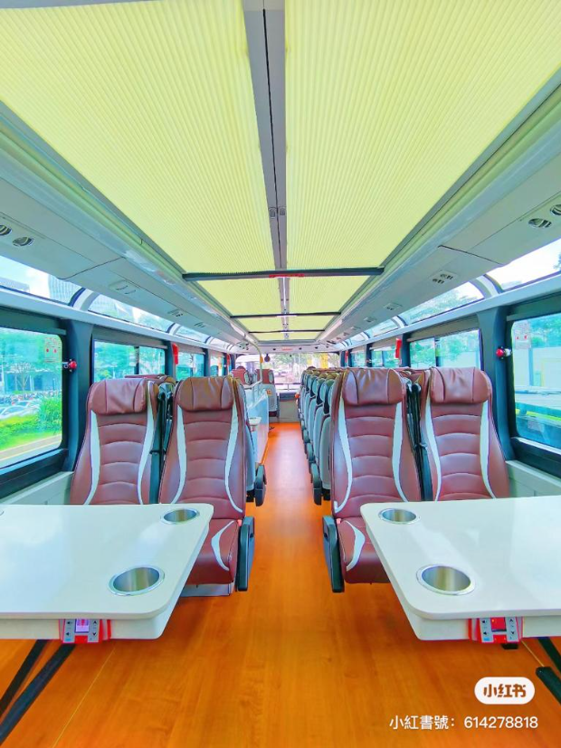 ▲旅游觀光巴士空間寬敞,設有皮質座椅及可以容納4人的小方桌。
