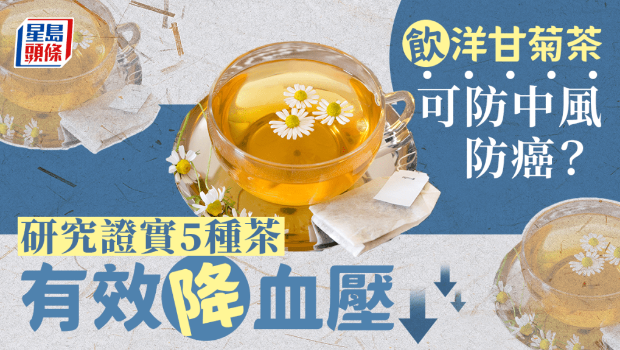 高血壓可導致中風、冠心病等疾病,近年有多項研究證實,多種茶所含的活性成分,對于調節血壓有正面影響。其中,有5種茶證實有效降血壓,維持血管健康,甚至可防中風防癌,例如洋甘菊茶。