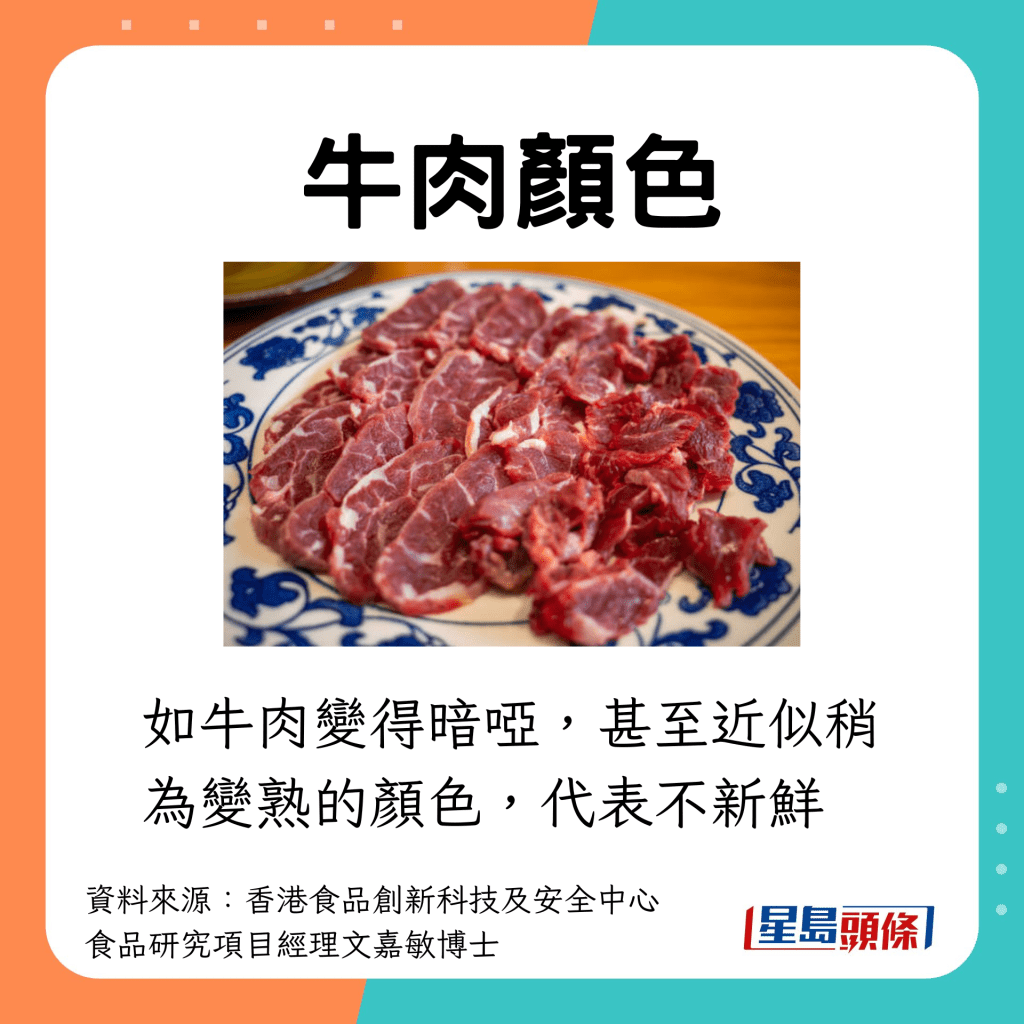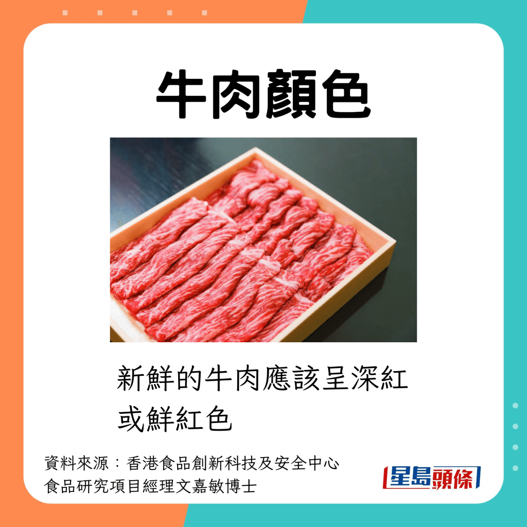 牛肉顏色:新鮮的應該呈深紅或鮮紅;如果牛肉變得暗啞,甚至近似稍為變熟的顏色,代表不新鮮