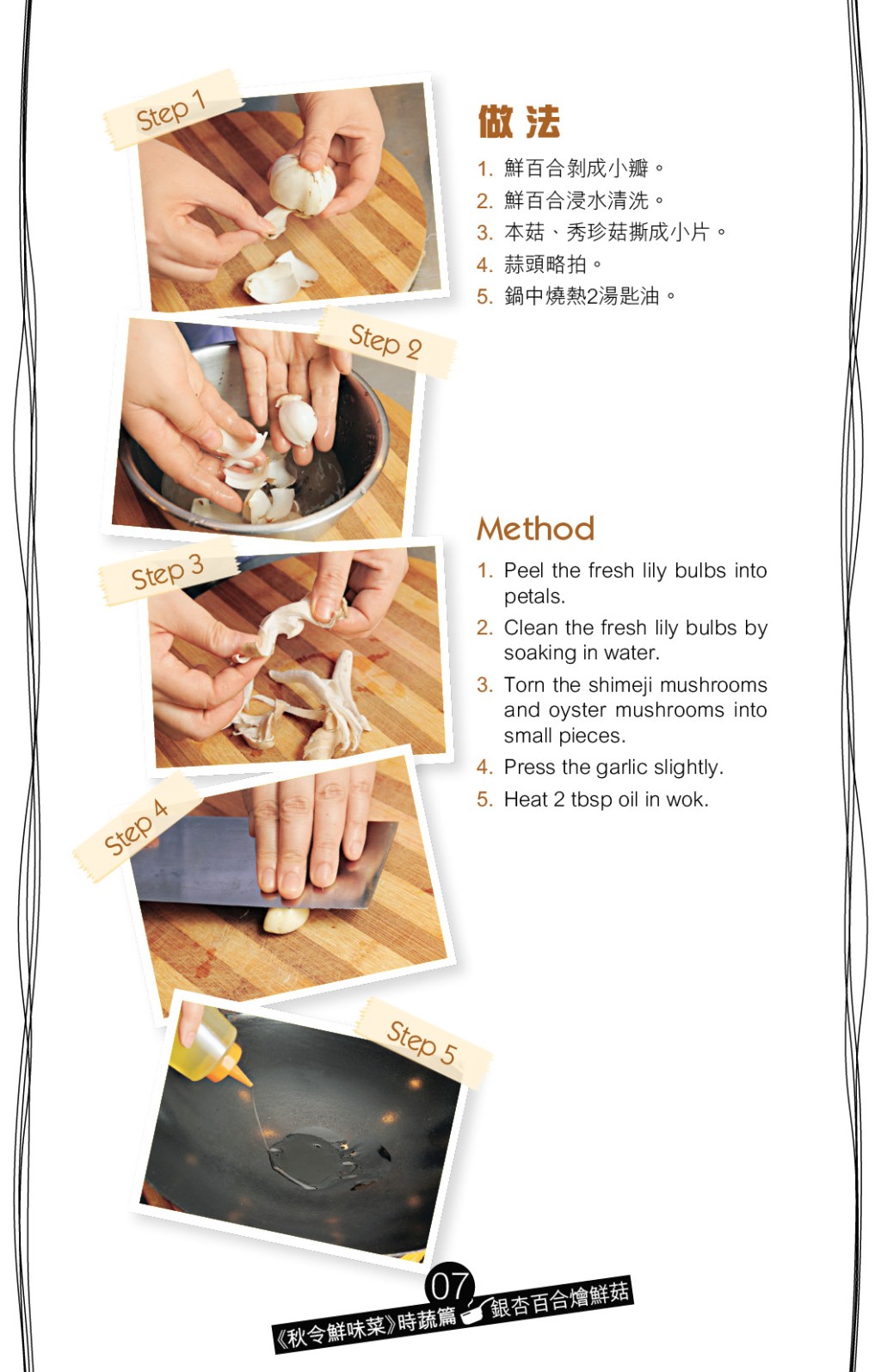 喜歡吃菇菌,這道素小炒銀杏百合燴鮮菇,必合胃口。先起油鑊爆香蒜頭,加鮮百合瓣、白果肉 、本菇、秀珍菇炒勻,下白果肉、清水、生抽煮至收汁,最后加糖、鹽及胡椒粉調味。烹調此家常菜,可按個人口味,加入適合炒煮的菇菌。另可購買現成白果肉入饌,若采用連殼白果取肉,謹記去掉帶苦味的果芯。
