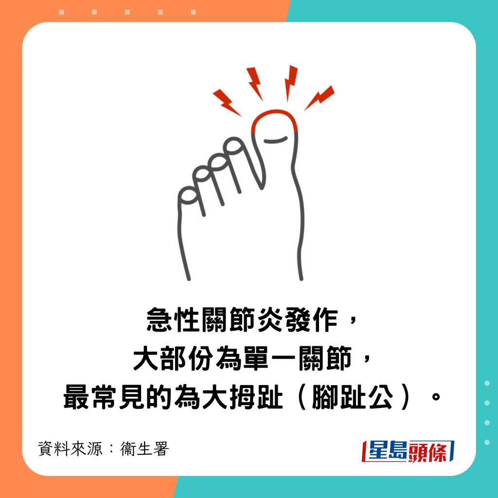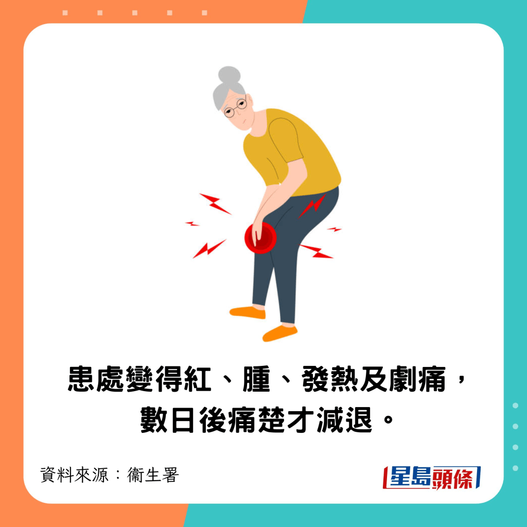 ▲患處突然變得紅、腫、發熱及劇痛,數日后痛楚才減退。