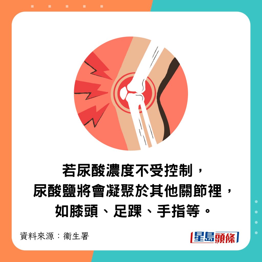 ▲若血液內的尿酸濃度不受控制,尿酸鹽將會凝聚于其他關節里,如膝頭、足踝、手指等。