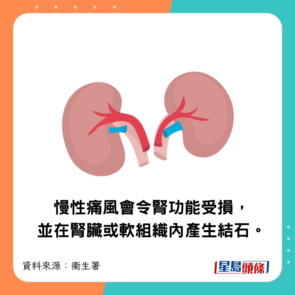 ▲慢性痛風會令腎功能受損,并在腎臟或軟組織內產生結石。
