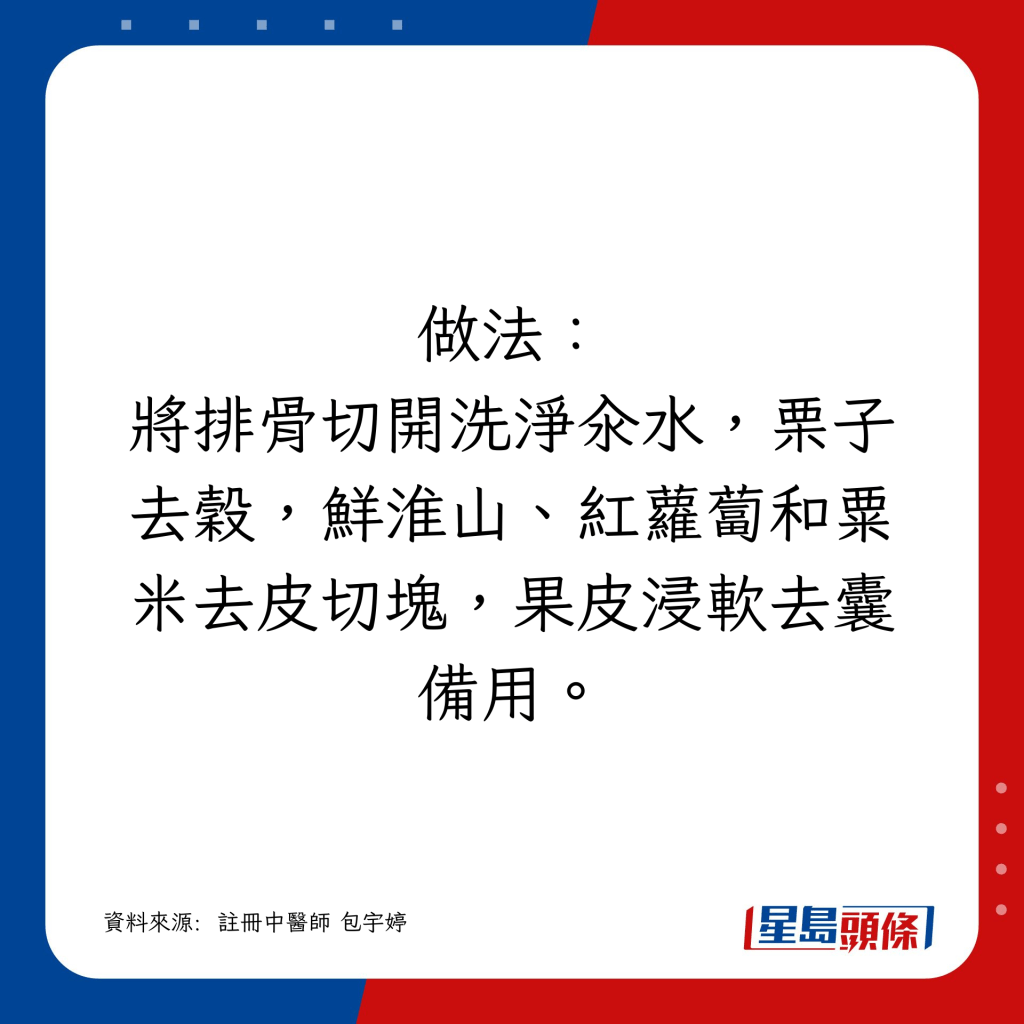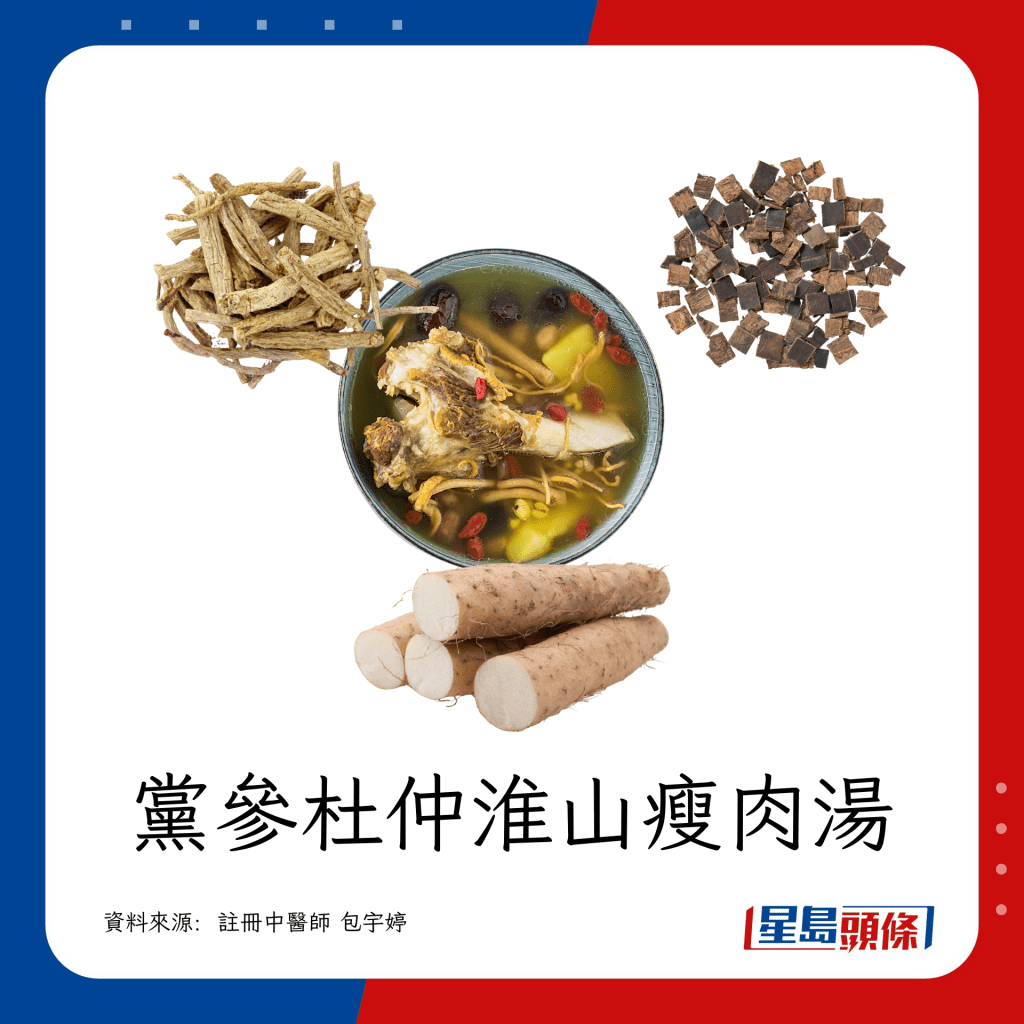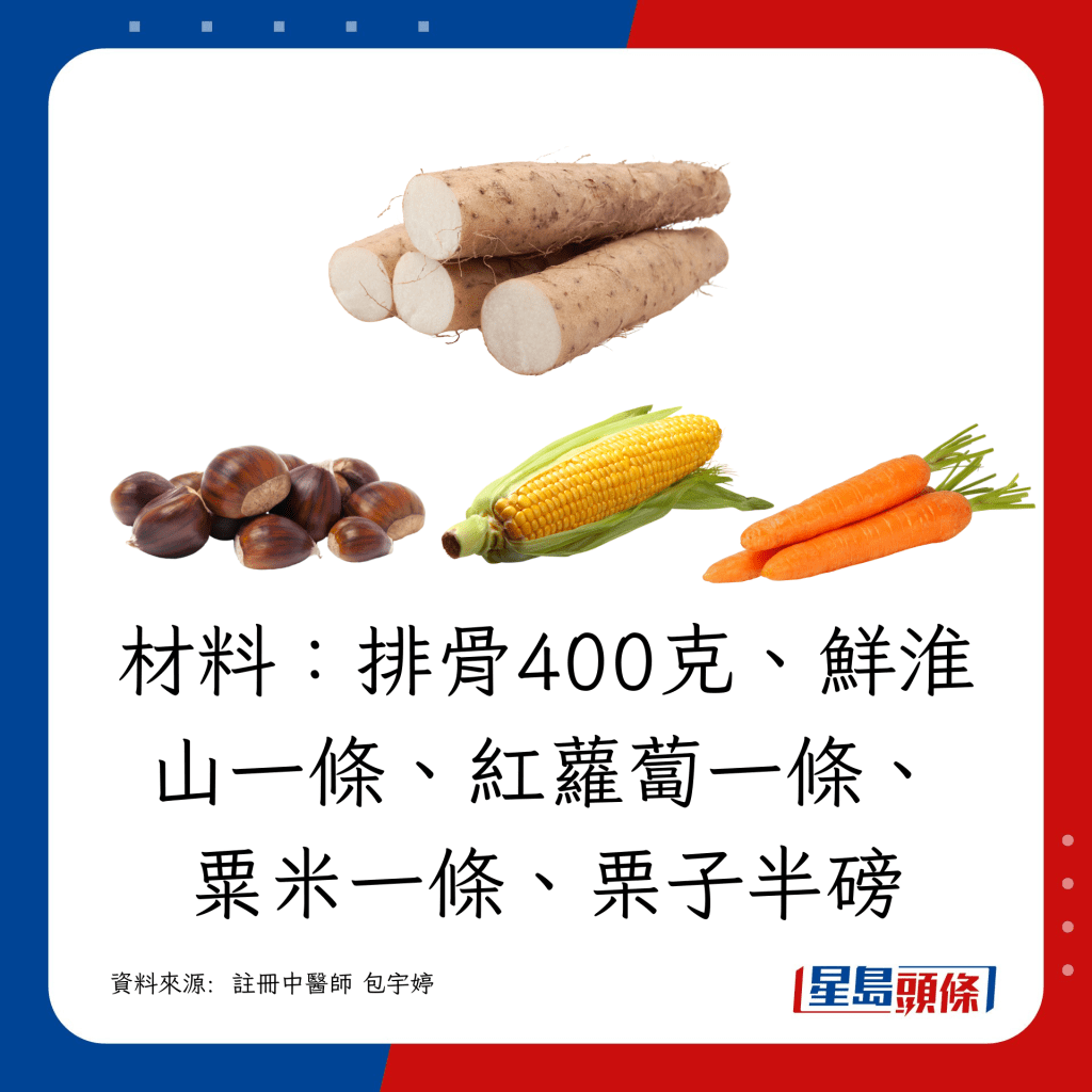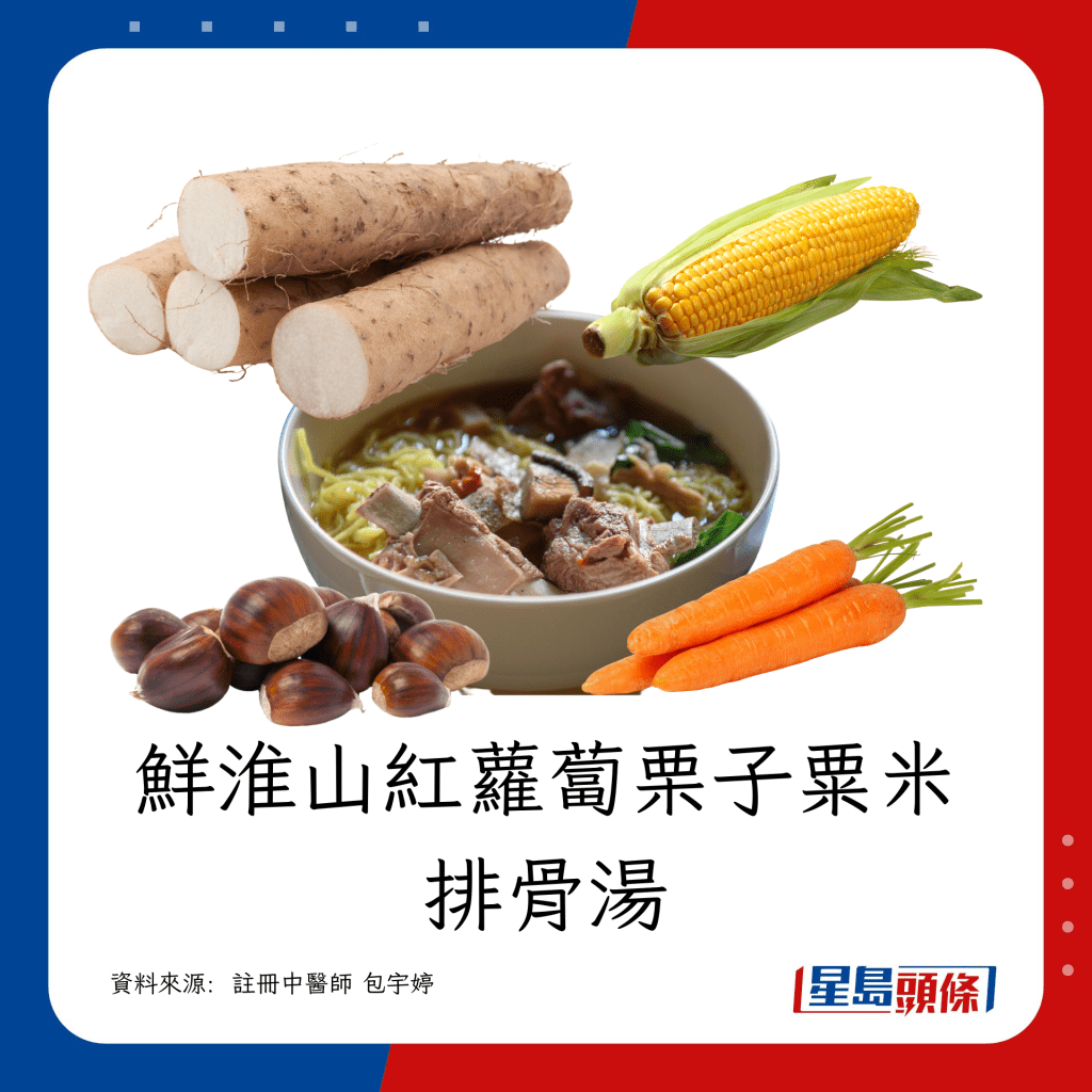 黨參杜仲淮山瘦肉湯、鮮淮山紅蘿卜栗子粟米排骨湯的功效、材料、做法: