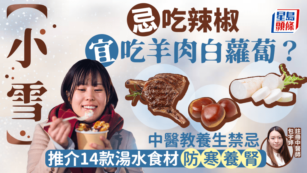 今天(11月22日)是二十四節氣的“小雪”,屬于冬季的第二個節氣。 注冊中醫師包宇婷接受《星島頭條》訪問指,小雪期間氣溫驟降且變得干燥,可引發與血管、呼吸系統等相關的疾病。 包醫師教小雪養生宜忌,例如忌吃辣椒,宜吃羊肉、白蘿卜。 她亦推介14款防寒養腎的湯水食材,以供大家在小雪節氣好好養生。