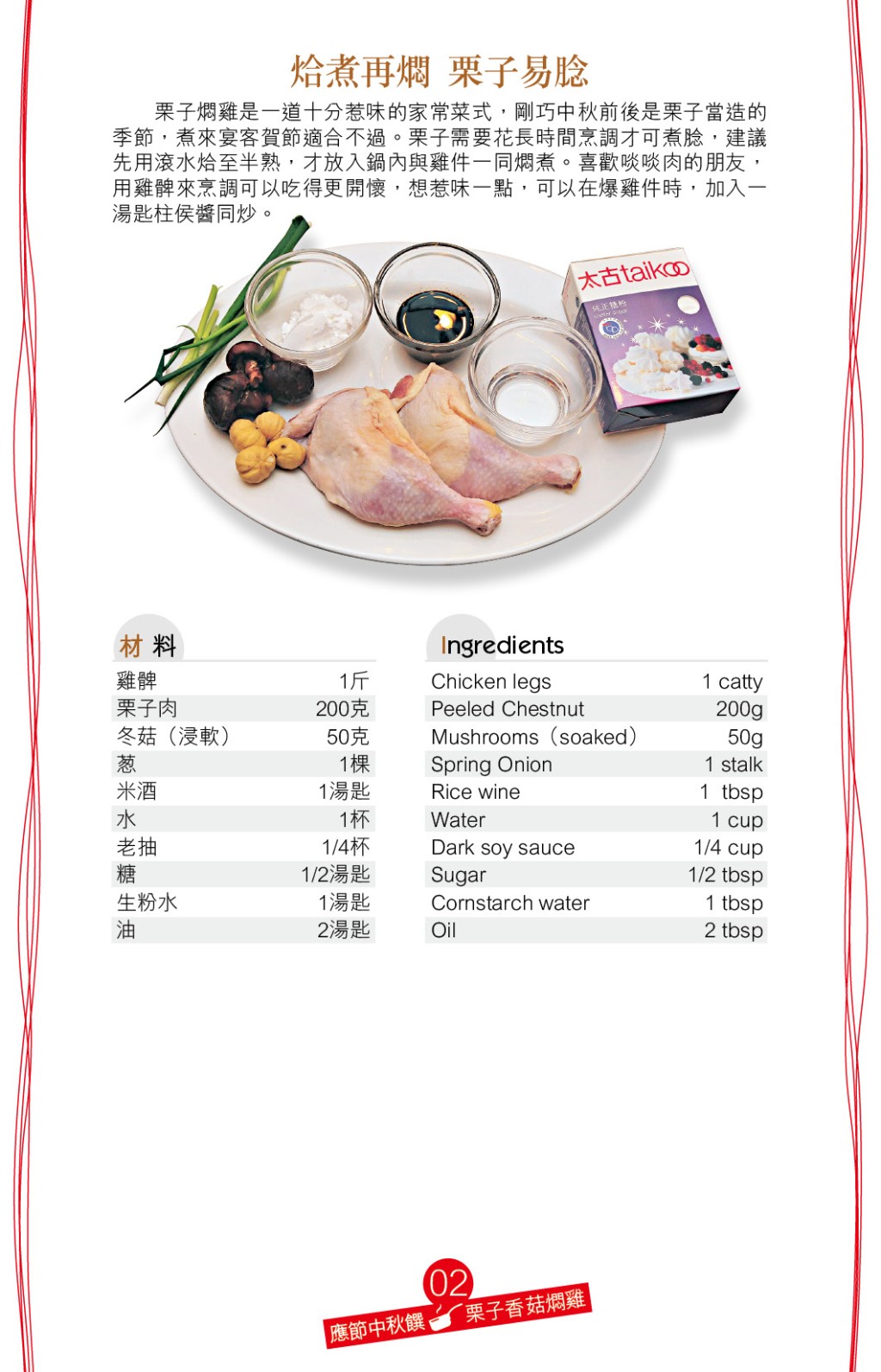 ▲想方便一點,可選用現成去殼的栗子肉,由于生栗子較堅實,烹調前可先用滾水烚至半熟,才與雞髀一起燜煮。