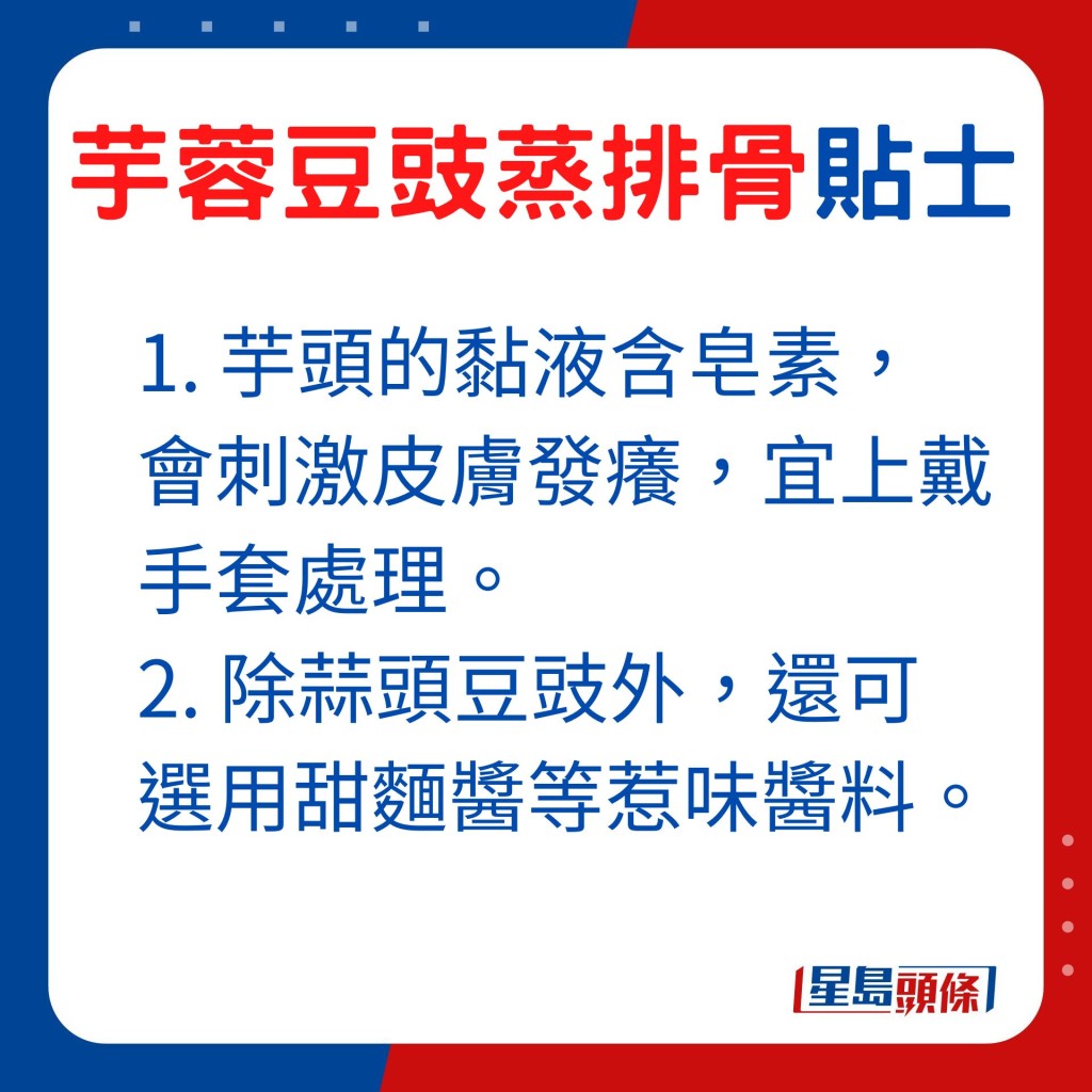 ▲處理食材時,留意芋頭的黏液含皂素,會刺激皮膚發癢,宜上戴手套處理。