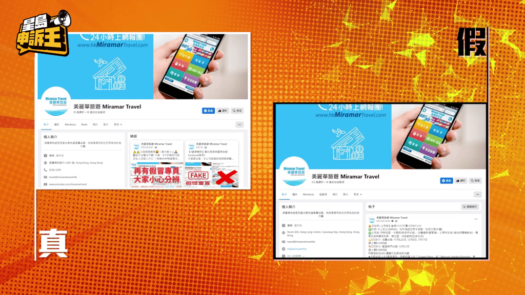 ▲香港幾間知名旅行社的官方專頁,都被騙徒完全復制,令消費者難以分辨。