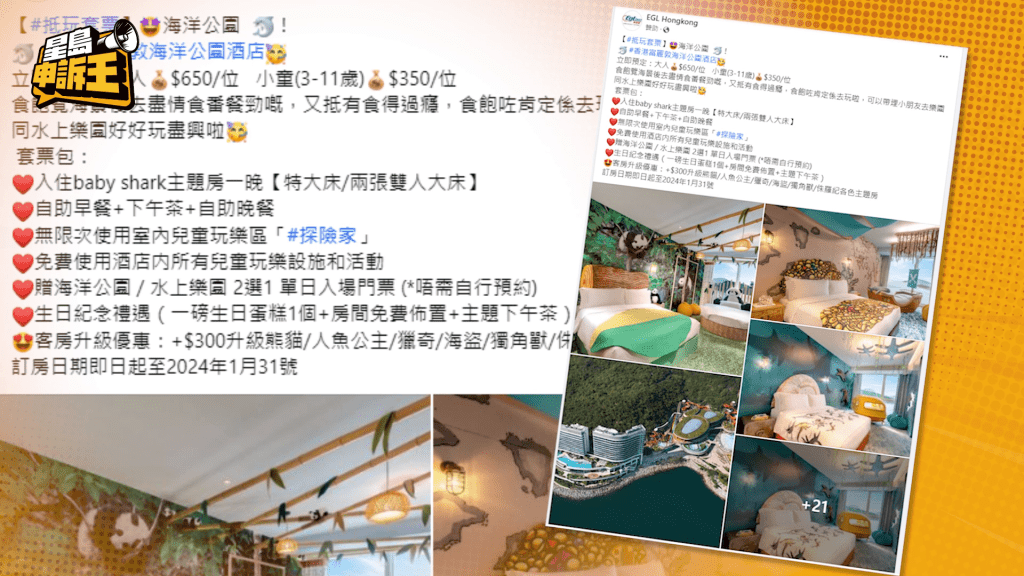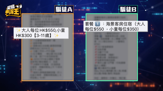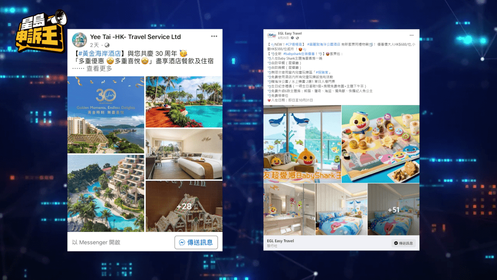 《星島申訴王》記者在Facebook發現兩個賣本地旅游套票的專頁,優惠廣告上有齊靚相,兩個專頁的賣家分別出售四星級的黃金海岸酒店,以及五星級的富麗敦海洋公園酒店套票,更稱有至抵價,最平550元一位大人,費用已包括一晚酒店連早餐及晚餐自助餐,可謂是打骨折。