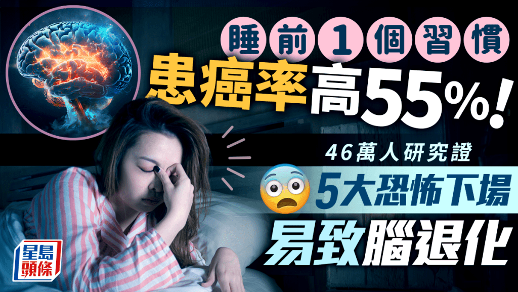 錯誤睡眠習慣會導致患癌!美國一項研究指,睡前1個習慣會對健康產生5大影響,包括增加55%患癌率,同時容易導致腦部退化等。要預防患癌或腦退化,可透過3招保命。