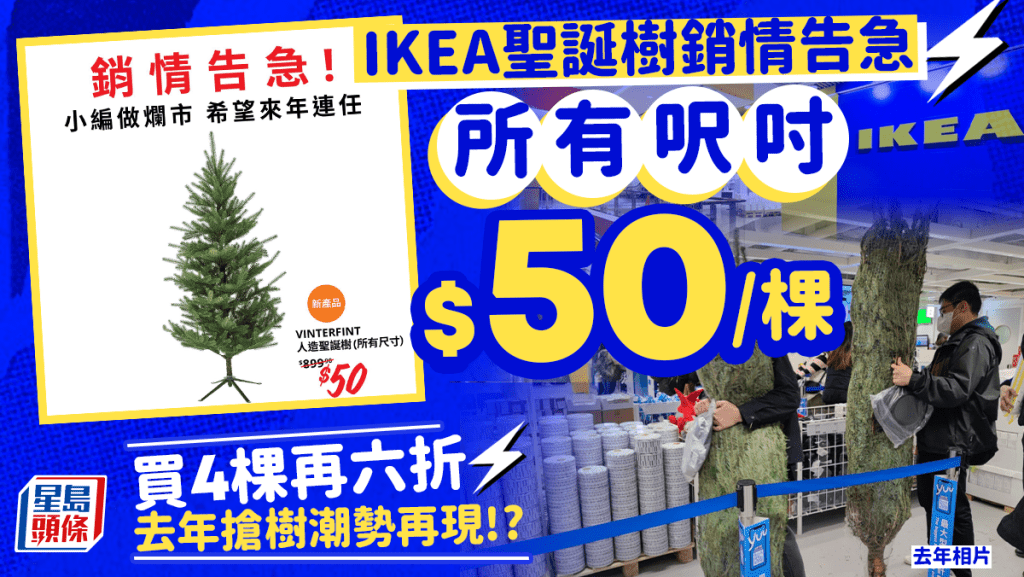去年十二月中,IKEA同樣以$50傾銷高達1.5至2米的高加索冷杉圣誕樹,當時消息一出,多間門市同樣引來搶購場面,當時在九龍灣門市,便有大量顧客帶備手推車推走高加索冷杉圣誕樹,不足2小時內被人清空,貨架清空只余掉落的松尖!