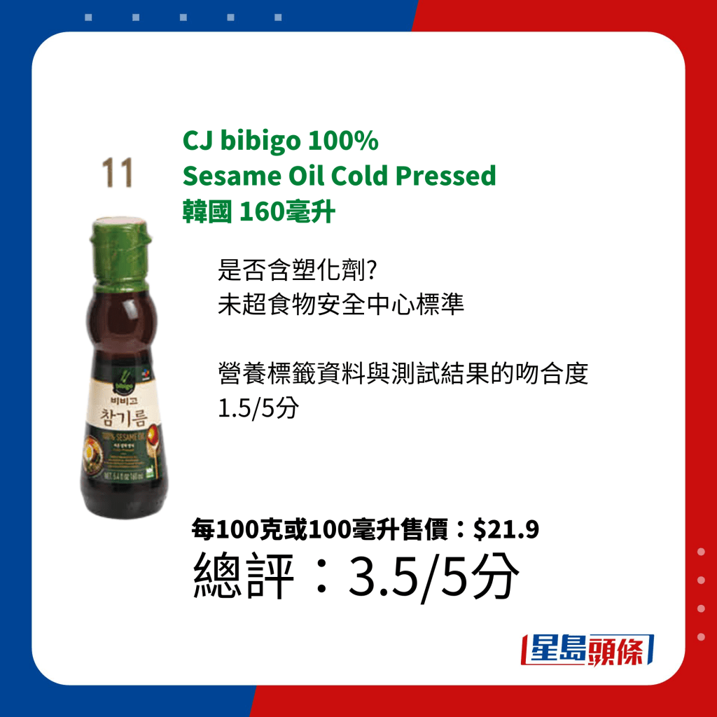 35款芝麻產品樣本中包括20款芝麻油、10款芝麻粉和5款芝麻醬。這些樣本被測試塑化劑、除害劑和營養素的含量,同時也測試芝麻油樣本中的污染物含量,以及芝麻粉和芝麻醬樣本中的霉菌毒素和致病菌含量。各個品牌的價格相差極大,以芝麻油為例,每100克的價格從11.9元到68.7元不等,相差超過4倍半。有趣的是,價格最高和最低的樣本在整體評分上都獲得了最高的5分,這表明價格和產品質素之間并沒有必然的關聯。