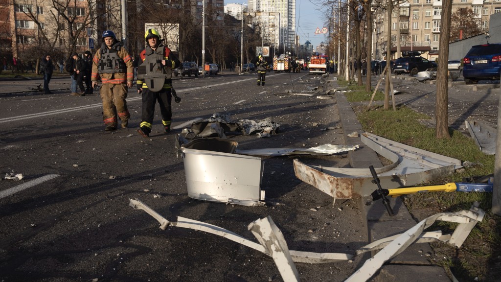 ▲基輔大廈被擊中,大型碎片掉落在街上。美聯社