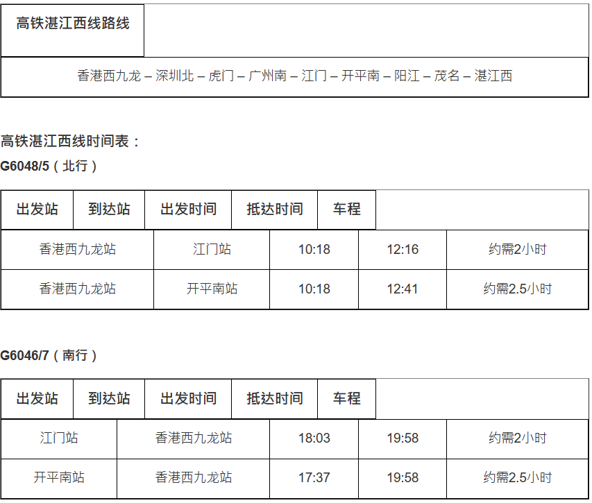 高鐵已于10月11日新增湛江西線,途經江門、開平南、陽江、茂名及終點站湛江西5個新站點,每日南行及北行各有1程班次。