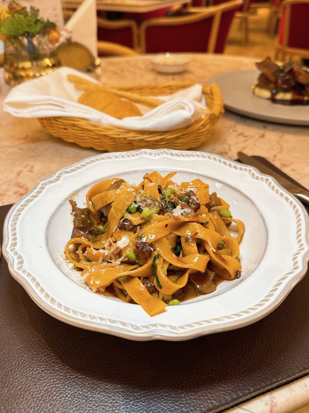 是日自選四道菜午市套餐(人均消費約220元人民幣),前菜大蝦沙律沿用肉厚清甜彈牙的鮮虎蝦入饌,簡單香煎便散發食材自身鮮味,配合火箭菜和自家調制的芥末蜜桃汁,微絲甜澀,風味清新。至于八爪魚沙律,八爪魚肉質不失細嫩而香氣十足,佐以風味各異的紅黃兩色車厘番茄,紅色番茄軟身多汁,而黃色的質感爽口,配合風味醇厚的黑橄欖、小酸豆,并以味道濃郁、咸香十足的鯷魚柳汁提味。接下來的粟米湯以Baby Corn迷你粟米配搭鮮肉米濃湯,前者微絲香甜而味道淡雅,后者味道鮮甜而質感細滑,天然風味可想而知。至于期待的主菜自家制Fettuccine意大利寬面配Oxtail Ragout燴牛尾,傳統肉汁精煉厚實,香草肉味香濃,然而醬汁出奇地甜,從服務員口中得悉,這是豌豆自身的獨特蜜甜。接下來的伊比利亞黑毛豬頸肉更見出色,橡果飼養的走地黑毛豬頸肉油脂肉汁豐富,且馀韻香甜濃郁,隨附的薯蓉質感豐盛細滑。