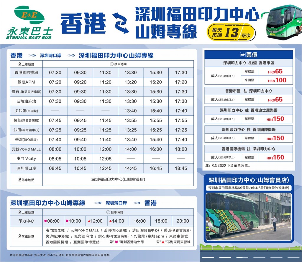 ▲香港往返福田山姆時間表及票價(圖片來源:Facebook@永東旅行社Eternal East Tours Co. Ltd)