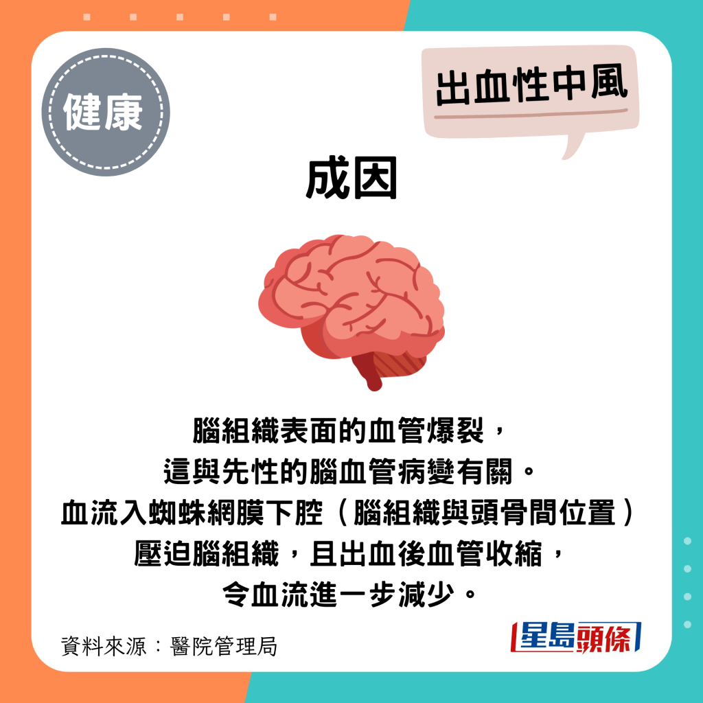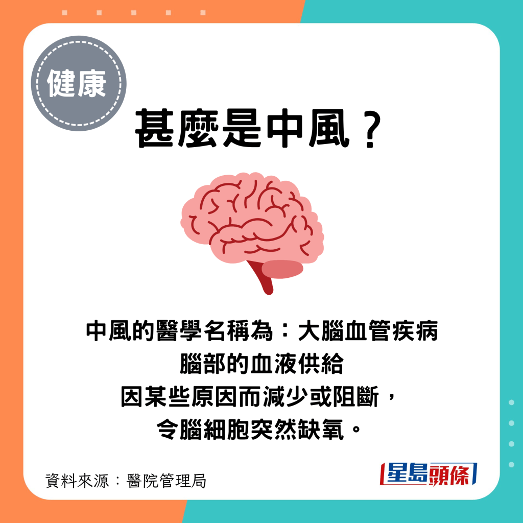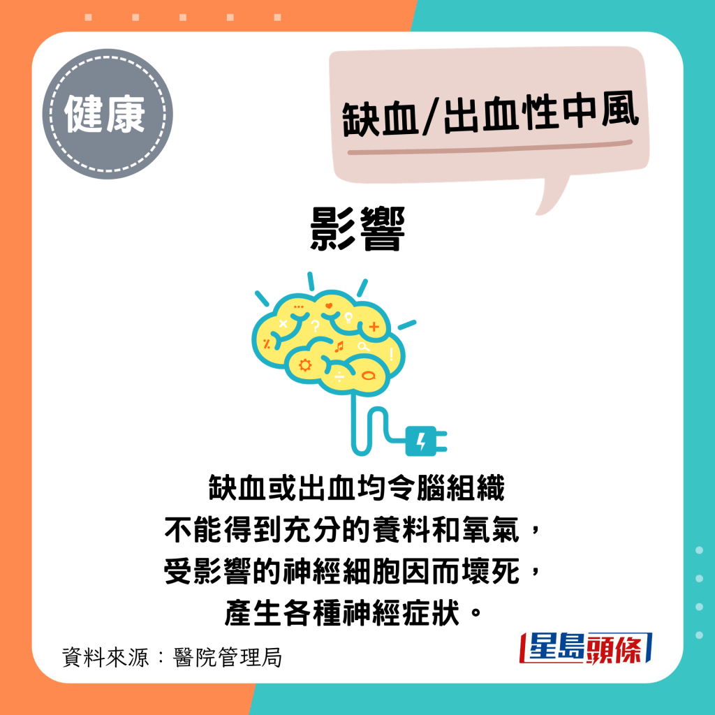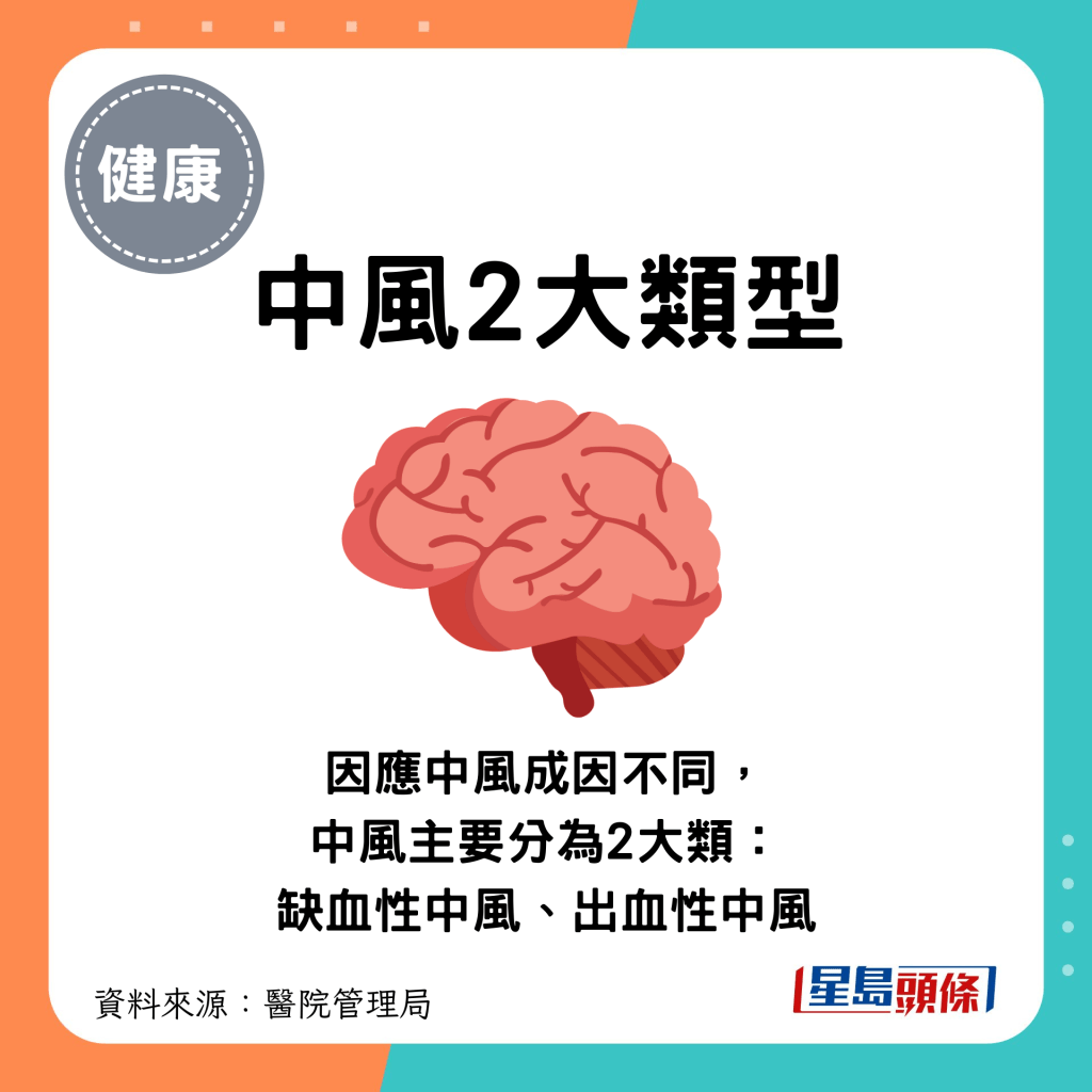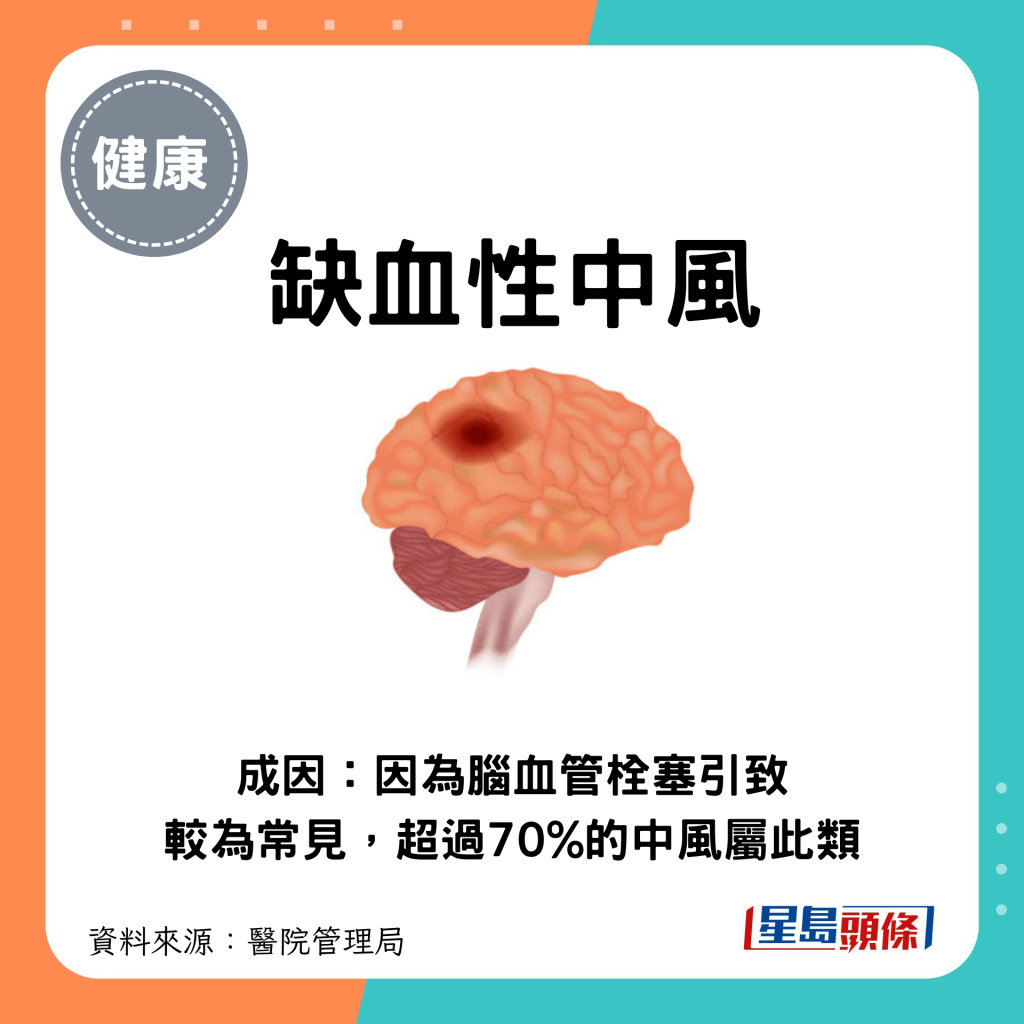 甚么是出血性中風?根據醫管局資料,中風可分為“缺血性中風”和“出血性中風”這2大類型,成因及特征如下: