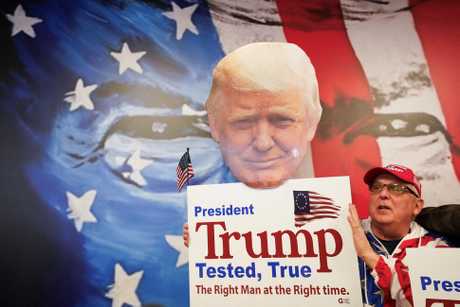 ▲新罕布什爾州一名特朗普支持者舉著特朗普肖像和標語牌子。路透社
