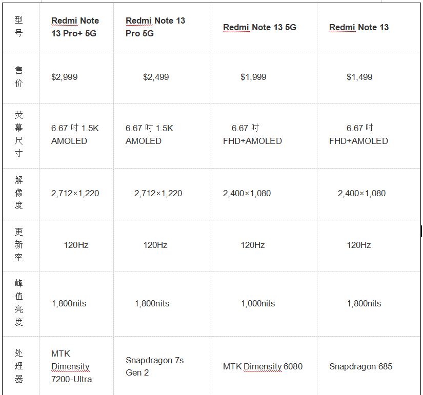 ▲Redmi Norte 13系列4款型號分別Note 13、Note 13 5G、Note 13 Pro及Note 13 Pro+。