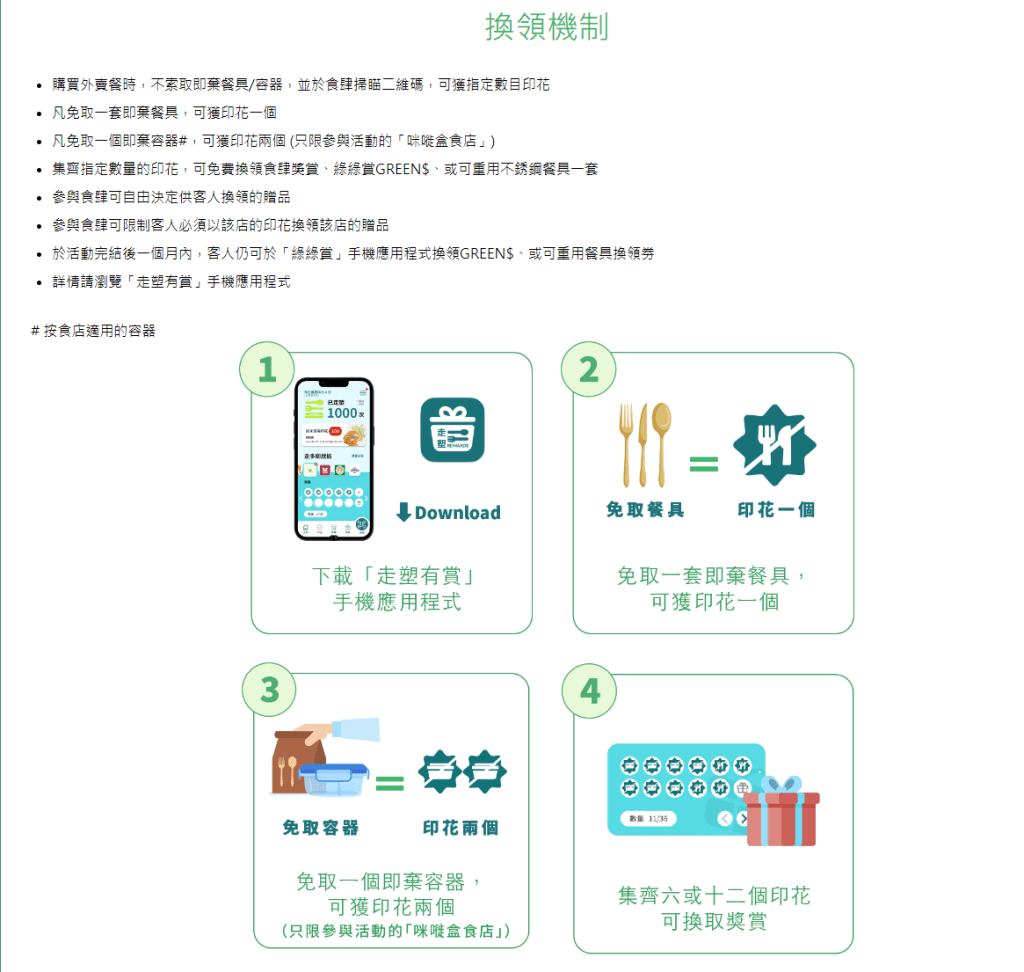 ▲環境運動委員會及環保署于去年11月舉辦第三屆“外賣走塑餐具先行”運動,透過“走塑有賞”手機應用程序,巿民購買外賣時“走塑、走即棄”,便可儲印花換獎賞。走塑有賞網頁截圖