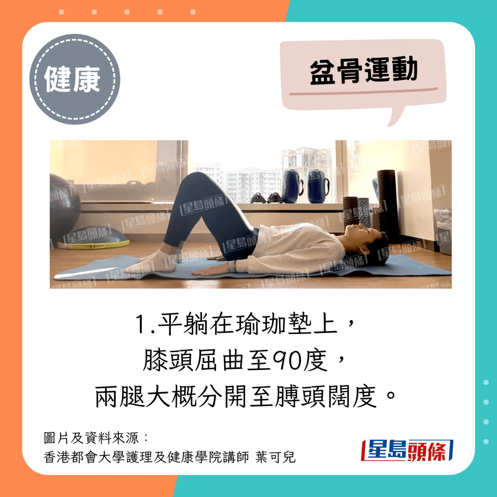 平躺在瑜珈墊上,膝頭屈曲至90度,兩腿大概分開至胳膊寬度。