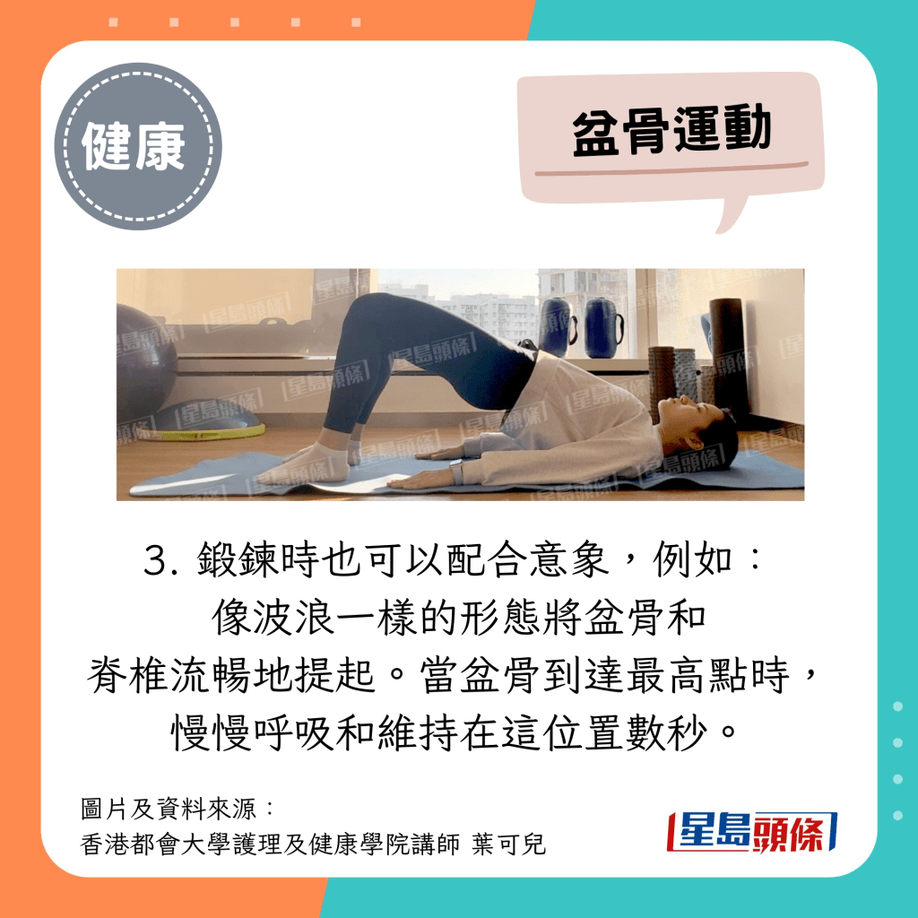 鍛煉時也可以配合意象,例如:像波浪一樣的形態將盆骨和脊椎流暢地提起。當盆骨到達最高點時,慢慢呼吸和維持在這位置數秒。