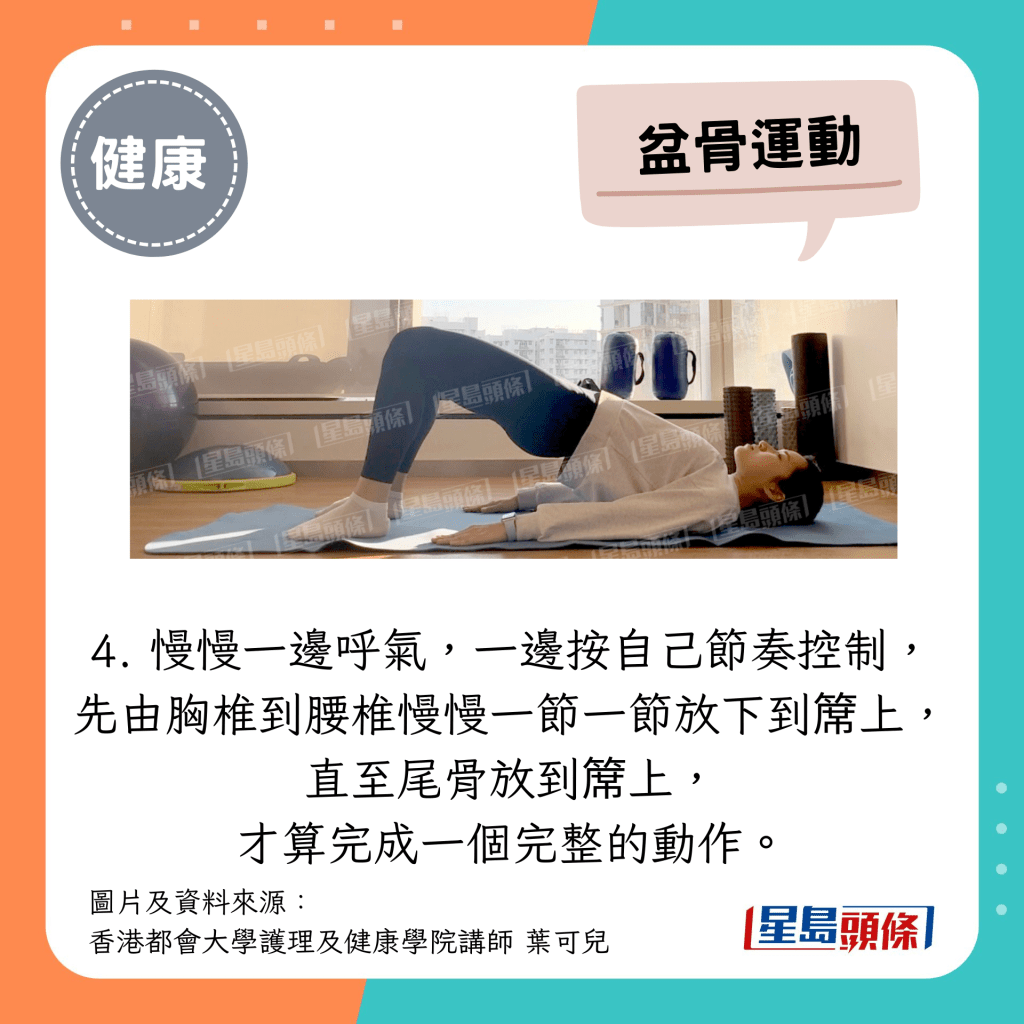 然后慢慢一邊呼氣,一邊按自己節奏控制,先由胸椎到腰椎慢慢一節一節放下到瑜伽墊上,直至尾骨放到席上,才算完成一個完整的動作。