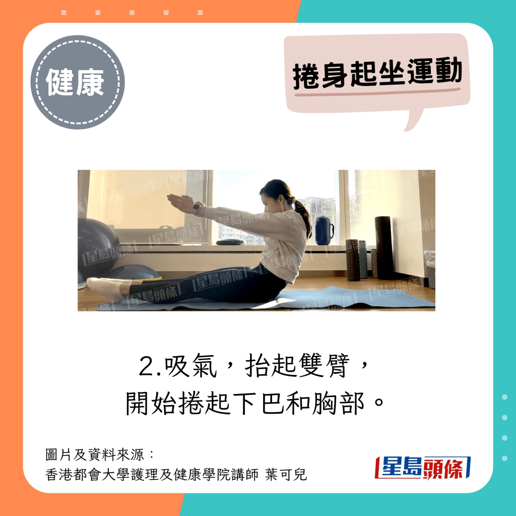 吸氣,抬起雙臂,開始卷起下巴和胸部。