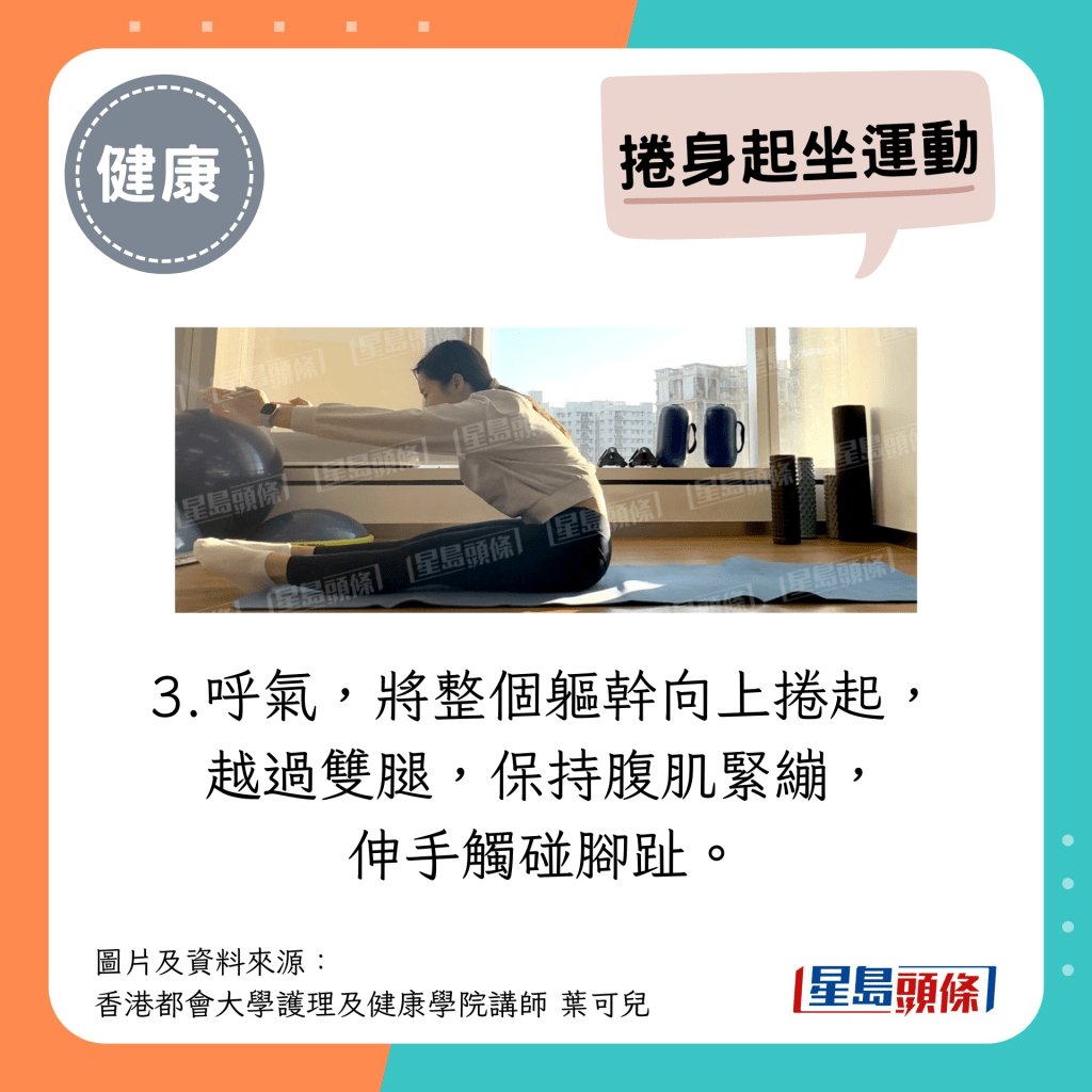 呼氣,將整個軀干向上卷起,越過雙腿,保持腹肌緊繃,伸手觸碰腳趾。