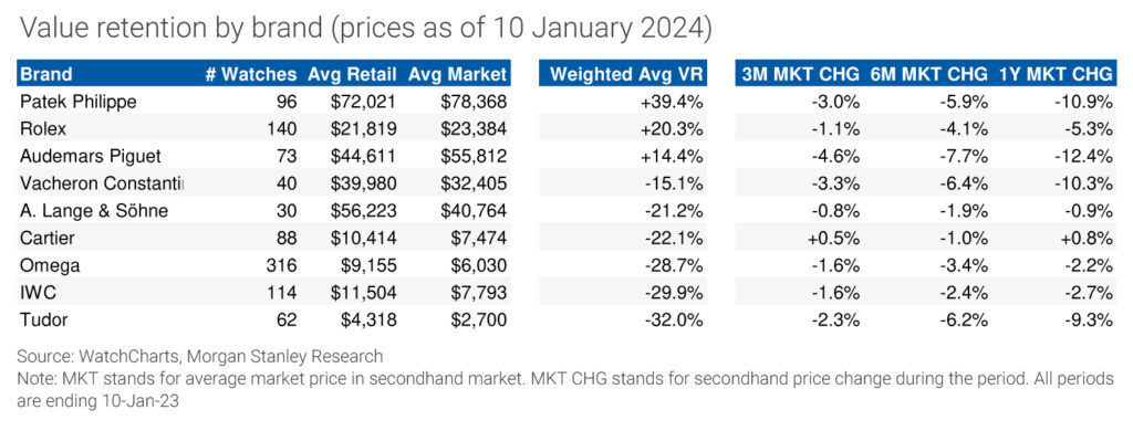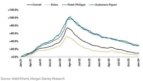 ▲摩根士丹利對WatchCharts價格走勢的分析,發現在市場波動下,名表二手市價仍比2021年初高出10%。