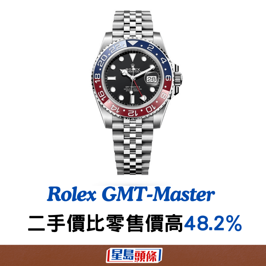▲勞力士的GMT-Master系列二手價可比零售價高出48.2%。
