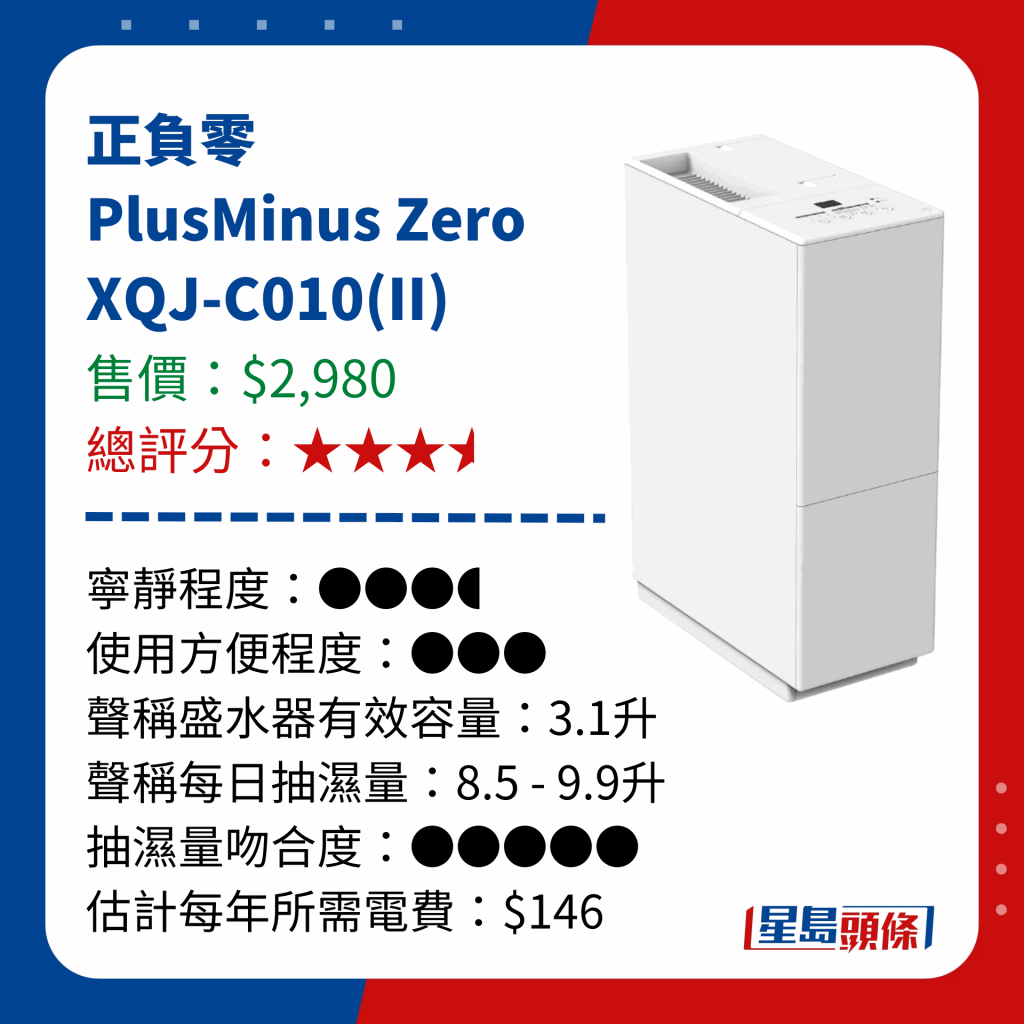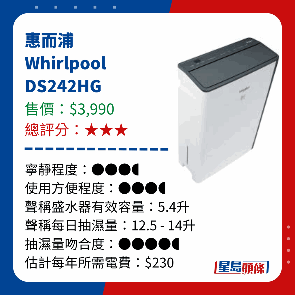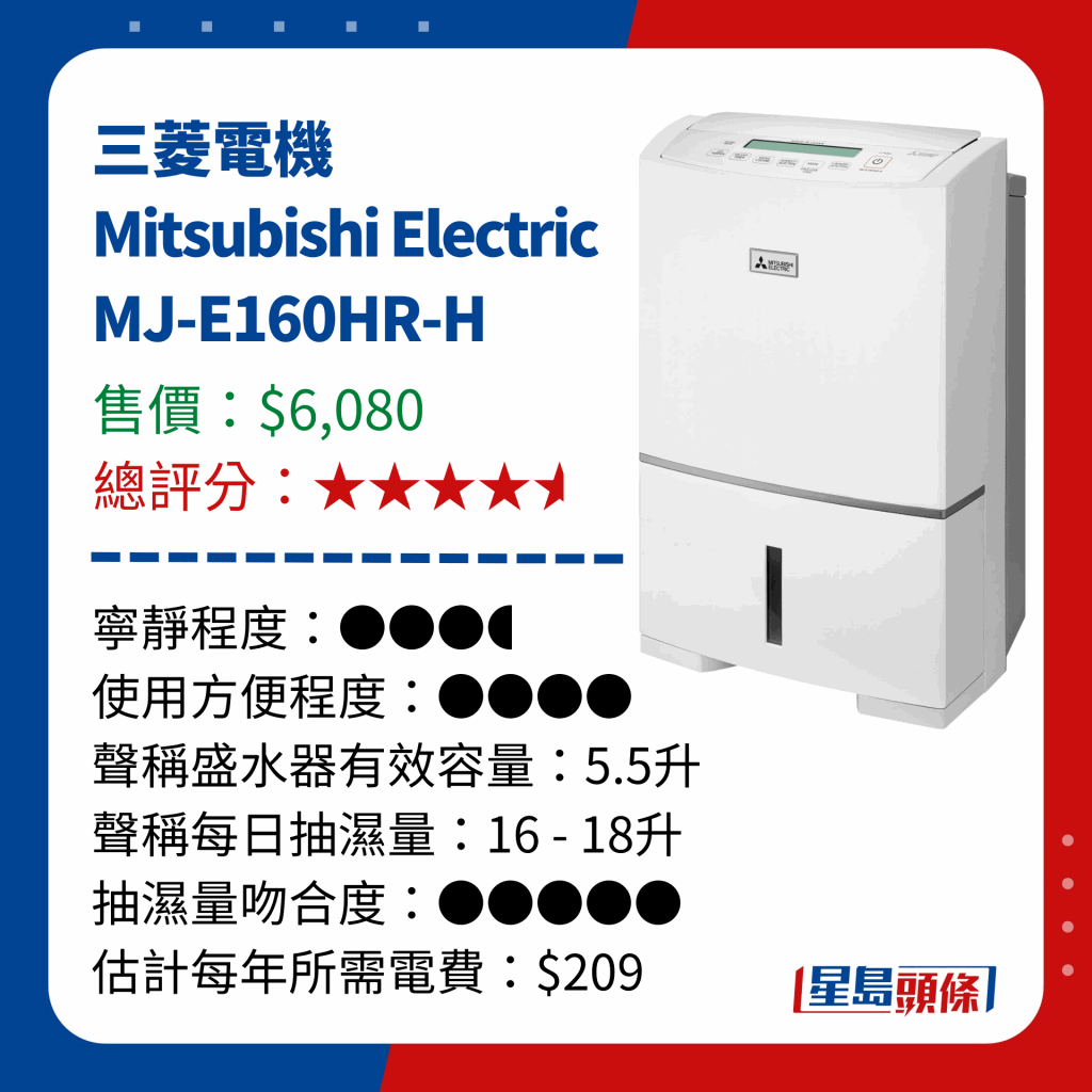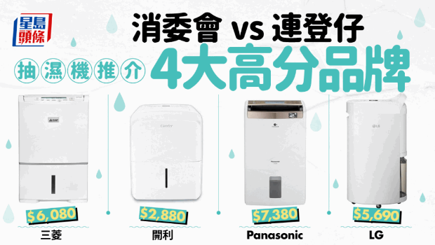 消委會2023年初曾測試了市面10款抽濕機及4款二合一空氣凈化抽濕機,售價由$2,099 - $6,080不等,當中8款抽濕機獲得總評分4星或以上(5星滿分),在抽濕量、使用方便程度及寧靜程度均有不俗表現。 其中三菱電機及LG的表現最為出色,獲得4.5星高評分,抽濕量達每日16-18升,不過兩款抽濕機的售價亦相對較高。
