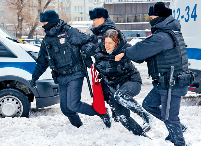 ▲警察周六在莫斯科紀念政治逼害受害者的悲傷之墻附近,拘捕一名悼念納瓦爾尼的女子。
